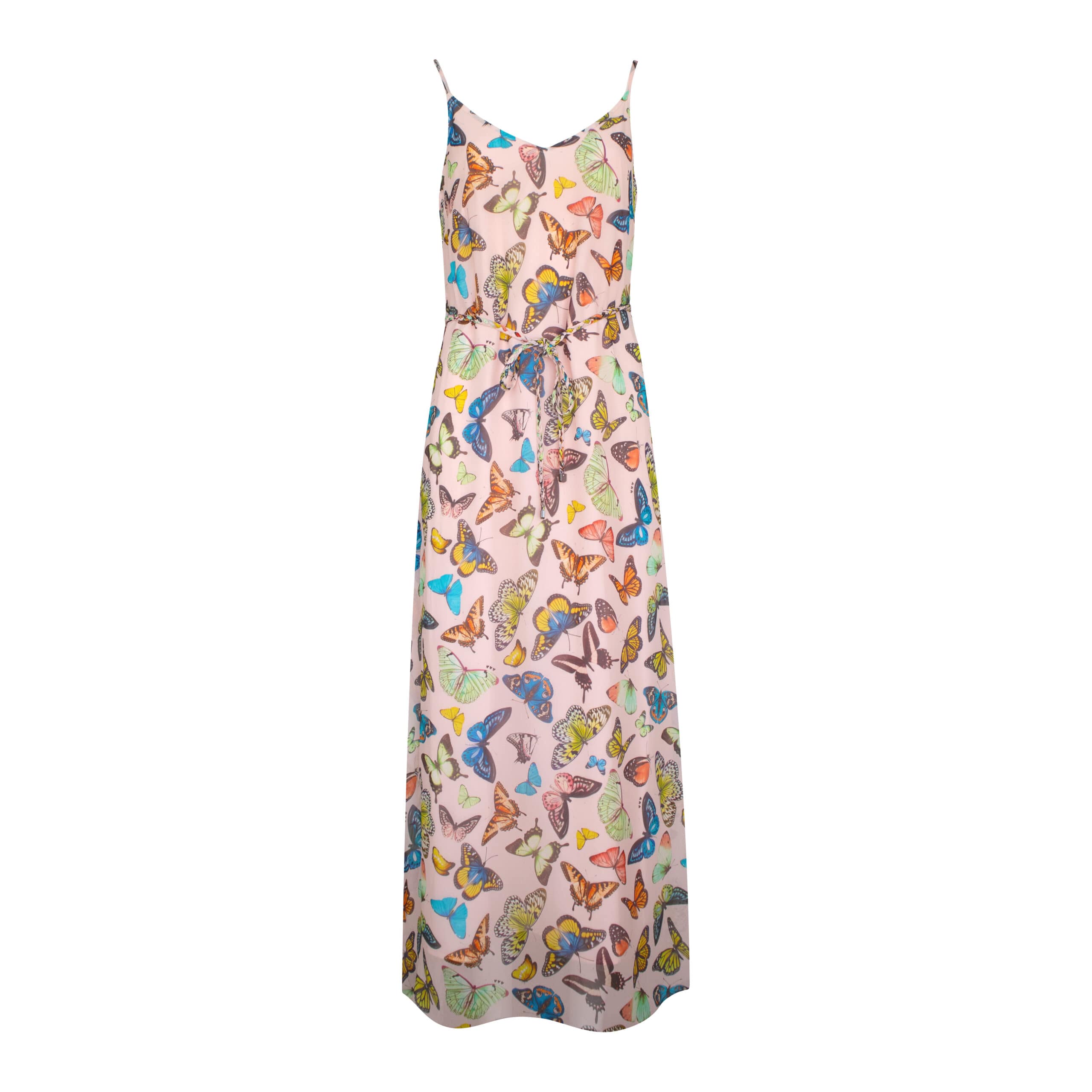 Mouwloos kleedje van Princess goes Hollywood. Deze lange, roze jurk is gemaakt van viscose en heeft een all over vlinder print. De jurk heeft een rechte pasvorm, verstelbare spaghettibandjes en een bijpassende gevlochten ceintuur.