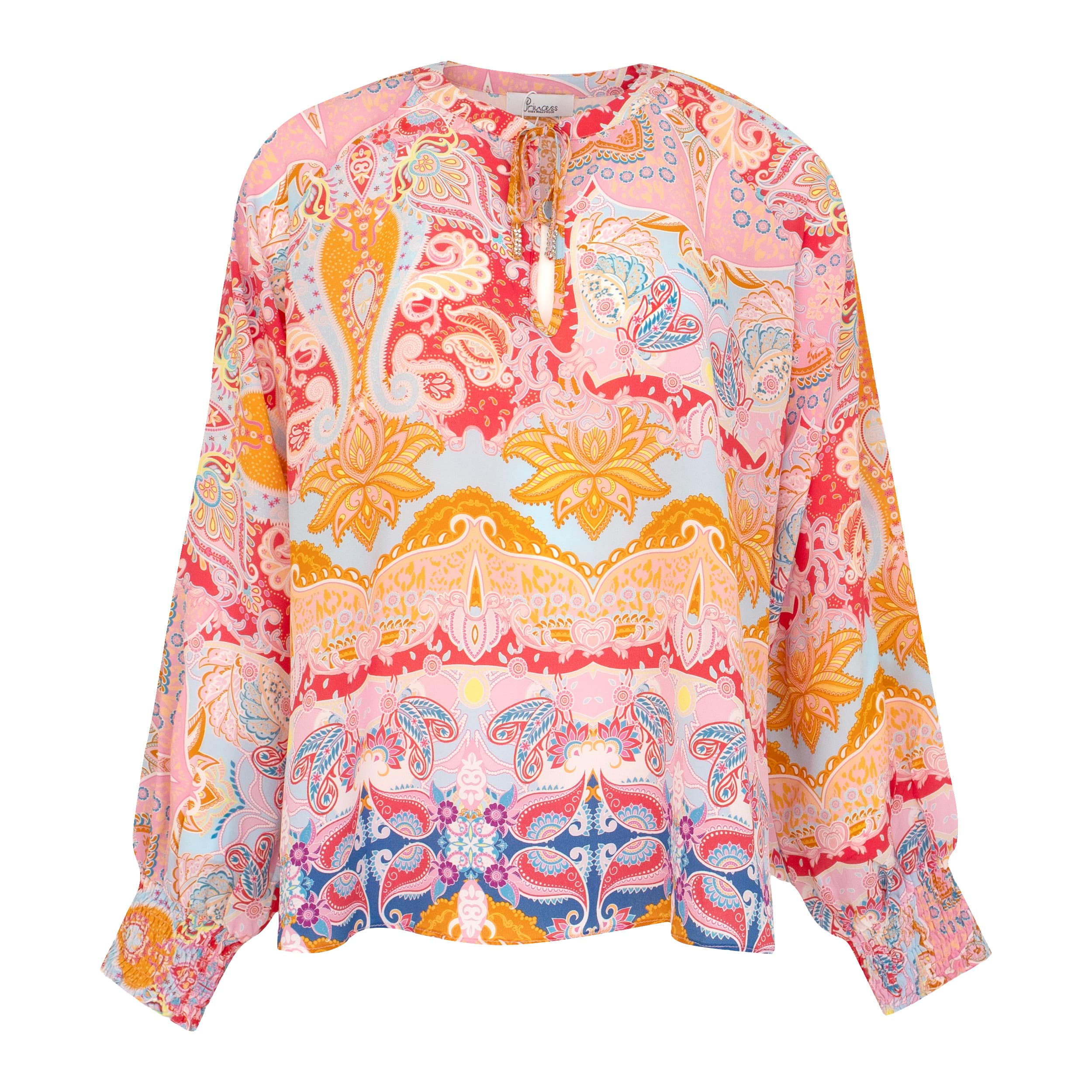 Losvallende tuniek van Princess goes Hollywood. Deze roze blouse is gemaakt van zijde en heeft een all over paisley print met gesmockte manchetten. De tuniek heeft aan de hals twee lintjes met steentjes die je aan de voorzijde in een strik kunt leggen.