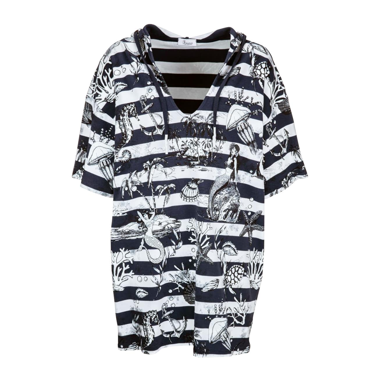 Kort gestreept kleedje van Princess goes Hollywood. Deze hoodie jurk is gemaakt van donkerblauw met wit gestreepte sweat stof met afbeeldingen van het zeeleven. De jurk heeft een relaxte oversized pasvorm, capuchon met treklinten, twee zakken, V-hals en korte mouwen.