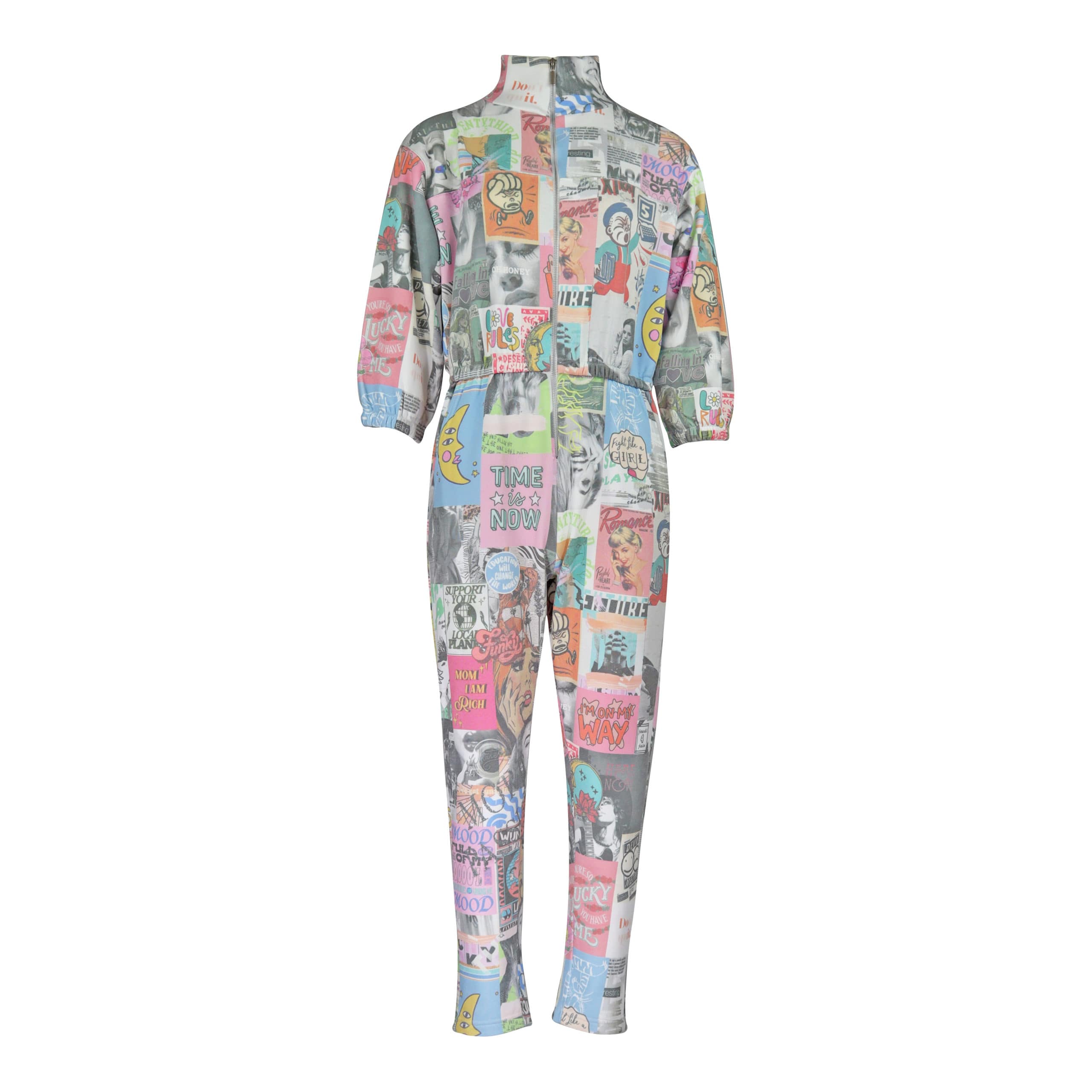 Sweat jumpsuit van Princess goes Hollywood. Deze ruim vallende jumpsuit is gemaakt van sweat stof en heeft een all-over patch motief met tijdschriften. De jumpsuit heeft een elastische taille, driekwart mouwen, twee steekzakken en sluit aan de voorzijde met een ritssluiting.