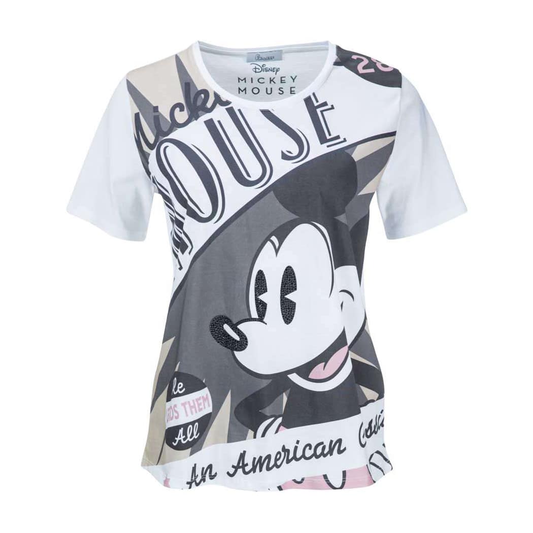Wit t-shirt van Princess goes Hollywood. Dit katoenen t-shirt heeft een normale pasvorm, ronde hals en korte mouwen. Op de voorzijde staat een afbeelding van Mickey met daaronder An American Classic. De ogen en neus van Mickey zijn bezet met zwarte steentjes.