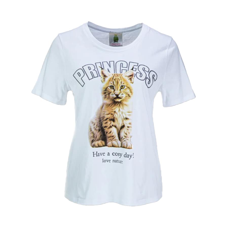 Wit t-shirt van Princess goes Hollywood, model lynx t-shirt in clear white. Dit t-shirt heeft een normale pasvorm, ronde hals en korte mouwen. Het t-shirt is gemaakt van katoen, heeft aan de voorzijde een afbeelding van een lynx met de tekst princess die bezet is met strass steentjes en have a cosy day!.
