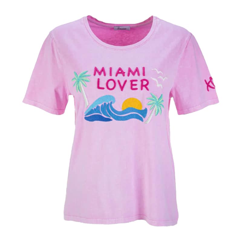 Roze t-shirt van Princess goes Hollywood, model Miami lover t-shirt in rose shadow. Dit t-shirt heeft een losse pasvorm, ronde hals en korte mouwen. Het t-shirt is gemaakt van katoen en heeft aan de voorzijde geborduurd Miami lover met zee en palmbomen.