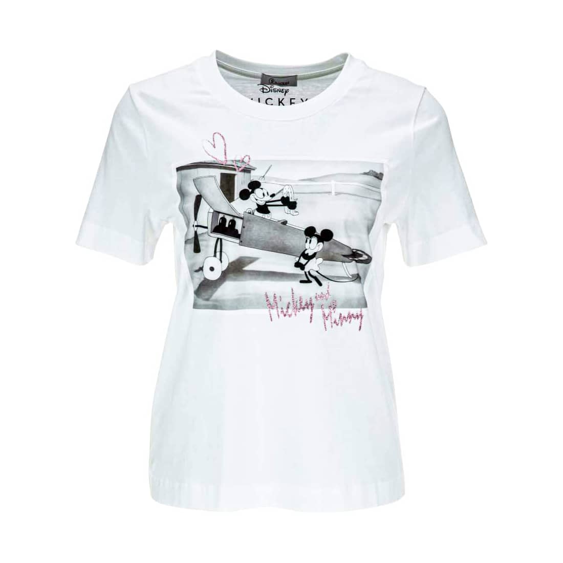 Wit t-shirt van Princess goes Hollywood. Dit katoenen t-shirt heeft een normale pasvorm, ronde hals en korte mouwen. Op de voorzijde staat een afbeelding van Mickey en Minnie met een vliegtuig. In roze glitters staan er twee hartjes en in het engels Mickey and Minny.