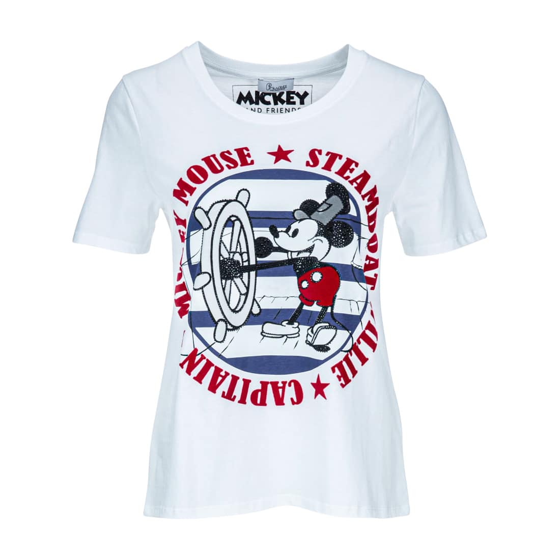 Wit t-shirt van Princess goes Hollywood. Dit katoenen t-shirt heeft een normale pasvorm, ronde hals en korte mouwen. Op de voorzijde staat een afbeelding van Mickey Mouse en de woorden Mickey Mouse steamboat Willie captain. Mickey Mouse is versiert met zwarte steentjes.