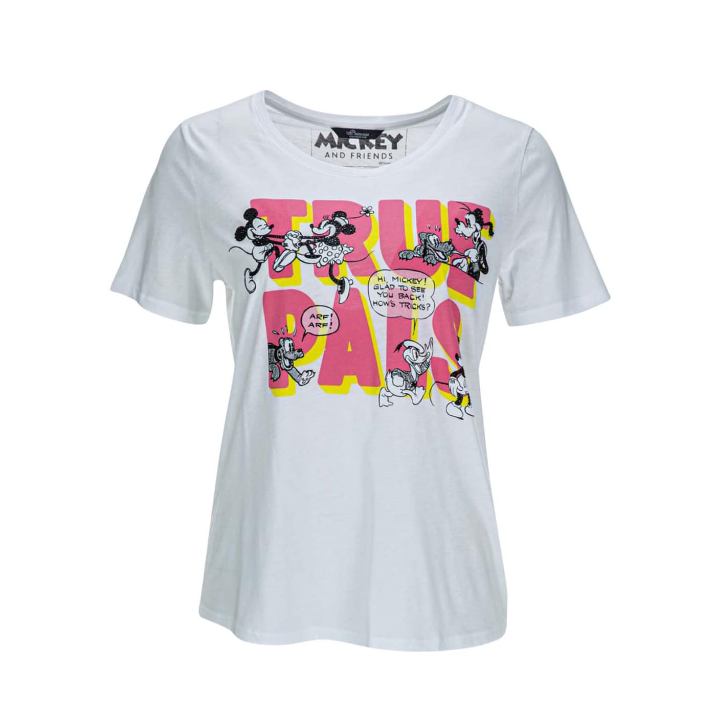 Wit t-shirt van Princess goes Hollywood. Dit shirt heeft op de voorzijde een afbeelding met Mickey en zijn vrienden met de woorden true pals. De zwarte delen van de tekening hebben fijne zwarte steentjes. Het shirt is gemaakt van een mix van katoen en modal, waardoor het extra zacht aanvoelt en fijn draagt.