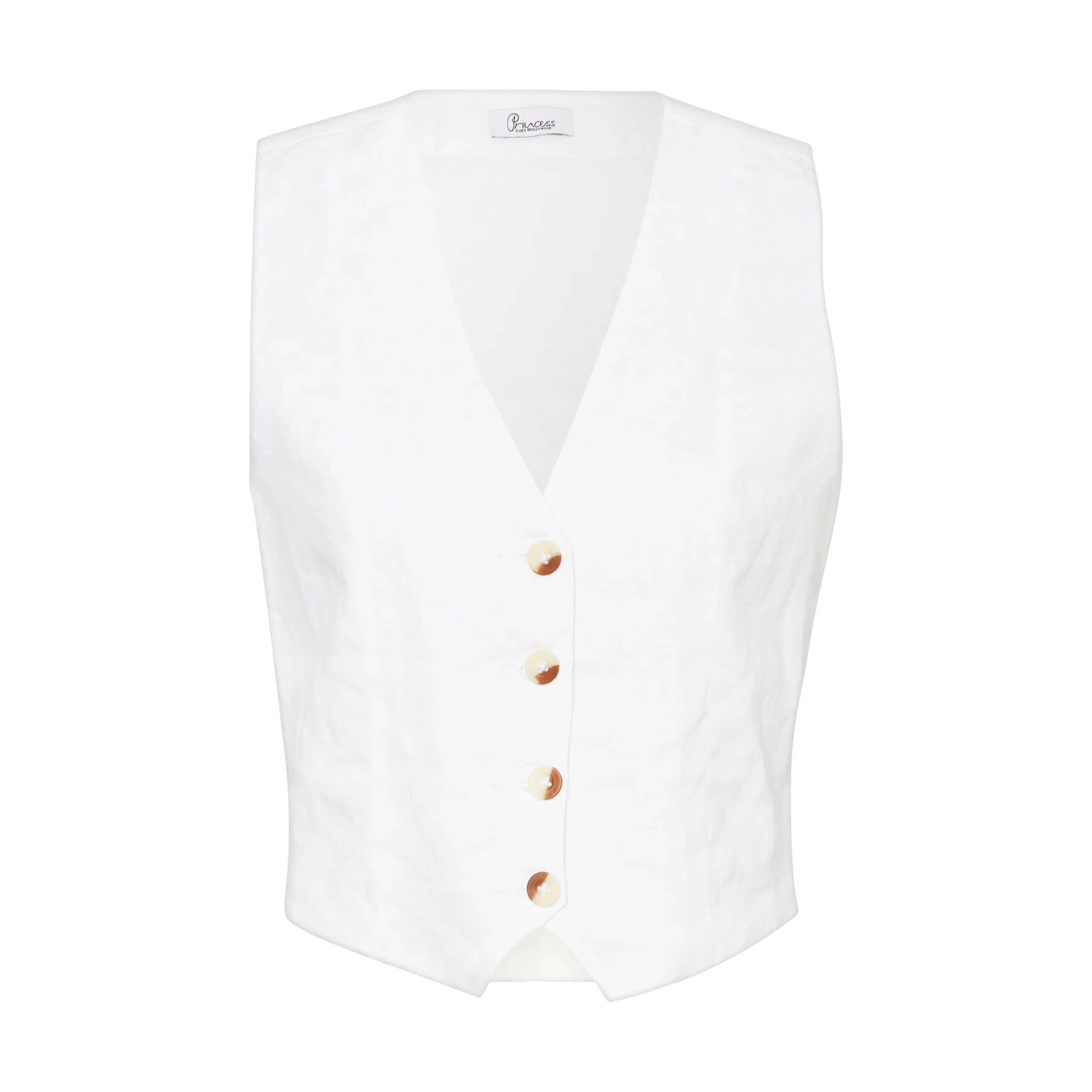 Wit linnen gilet van Princess goes Hollywood, model linen vest in clear white. Dit gilet heeft een normale pasvorm en sluit met vier bruine knopen aan de voorzijde. De gilet is gemaakt van 100% linnen en heeft een V-hals.