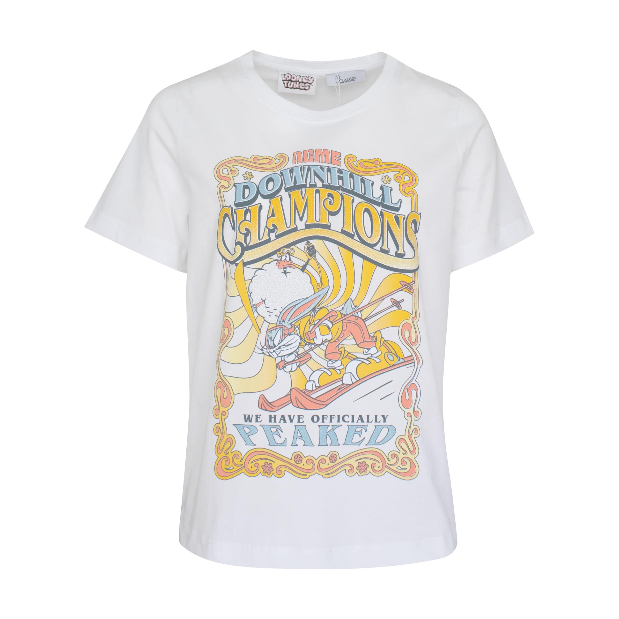 Wit t-shirt van Princess goes Hollywood, model bugs bunny ski t-shirt in clear white. Dit t-shirt heeft een normale pasvorm met een afbeelding van Bugs Bunny met we have officially peaked bezet met strass steentjes. Het t-shirt heeft korte mouwen, ronde hals en is gemaakt van katoen.