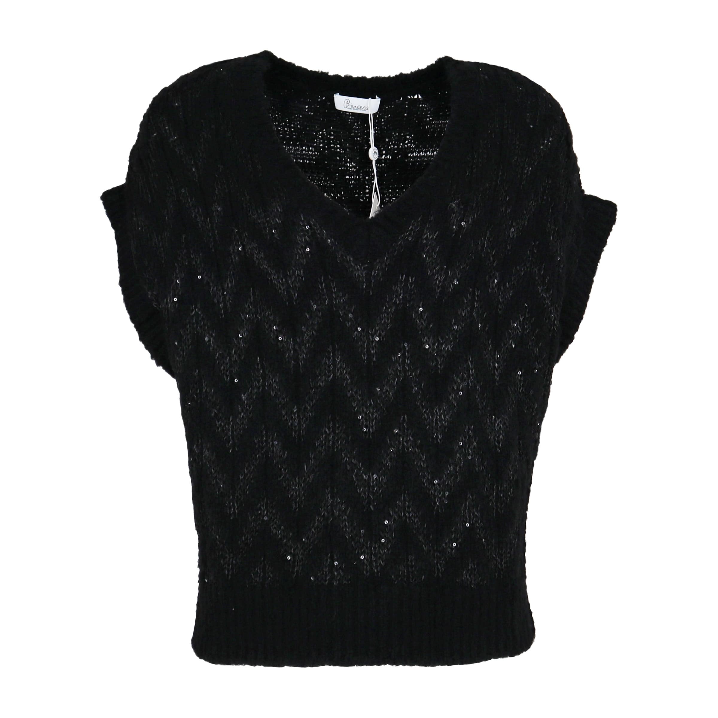 Gebreide debardeur van Princess goes Hollywood, model pullunder zic-zac sequins. Dit mouwloze vest is gemaakt van zwarte merinowol in zigzag motief. De spencer heeft een los vallende pasvorm met een V-hals en zwarte pailletjes.