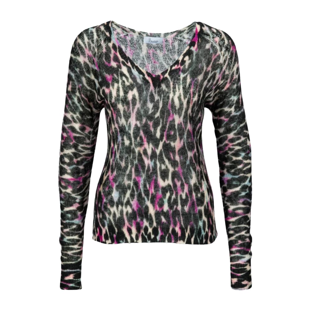 Los vallende fijn gebreide pullover van Princess goes Hollywood, model sweater pink leo. Deze trui is gemaakt van wol mix met mohair en heeft een luipaard tekening. De pull heeft een V-hals en lange mouwen.