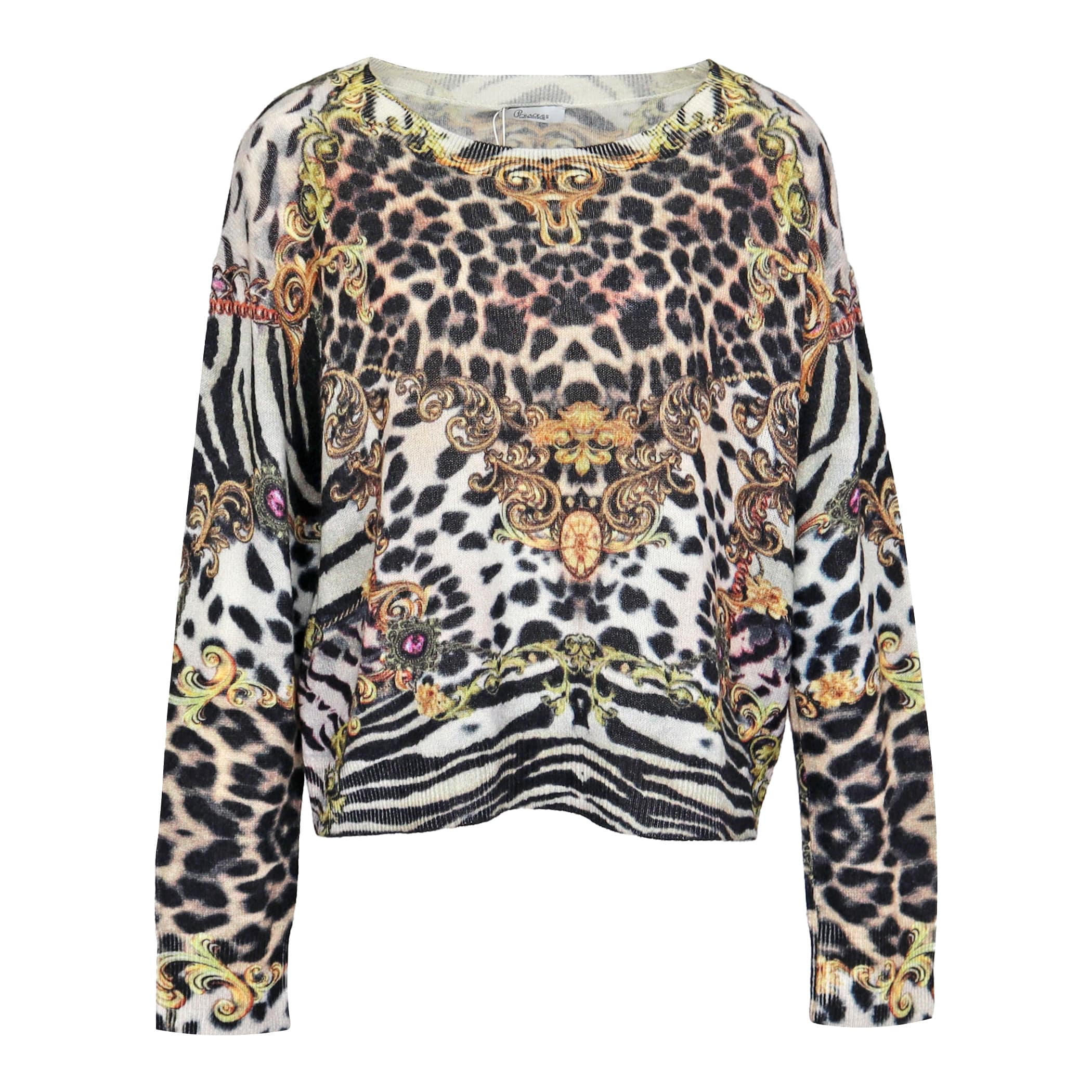 Wollen pull van Princess goes Hollywood, model pullover patch print in wild animal print. Deze fijngebreide trui is gemaakt van 90% wol en 10% kasjmier en heeft een luipaard print met barok elementen. De trui heeft een V-hals, lange mouwen en korte, boxy pasvorm.