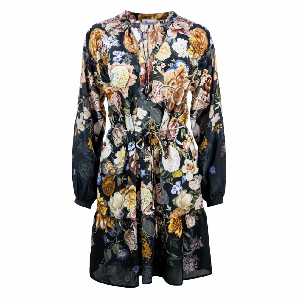 Zijden kleedje van Princess goes Hollywood, model silk flower volant dress in autumn flower. Deze jurk is gemaakt van zijde, heeft een zwarte basis met bloemen print en valt boven de knie. De jurk heeft een uitlopende pasvorm, lange mouwen, V-hals met koordjes en een vast koord in de taille.