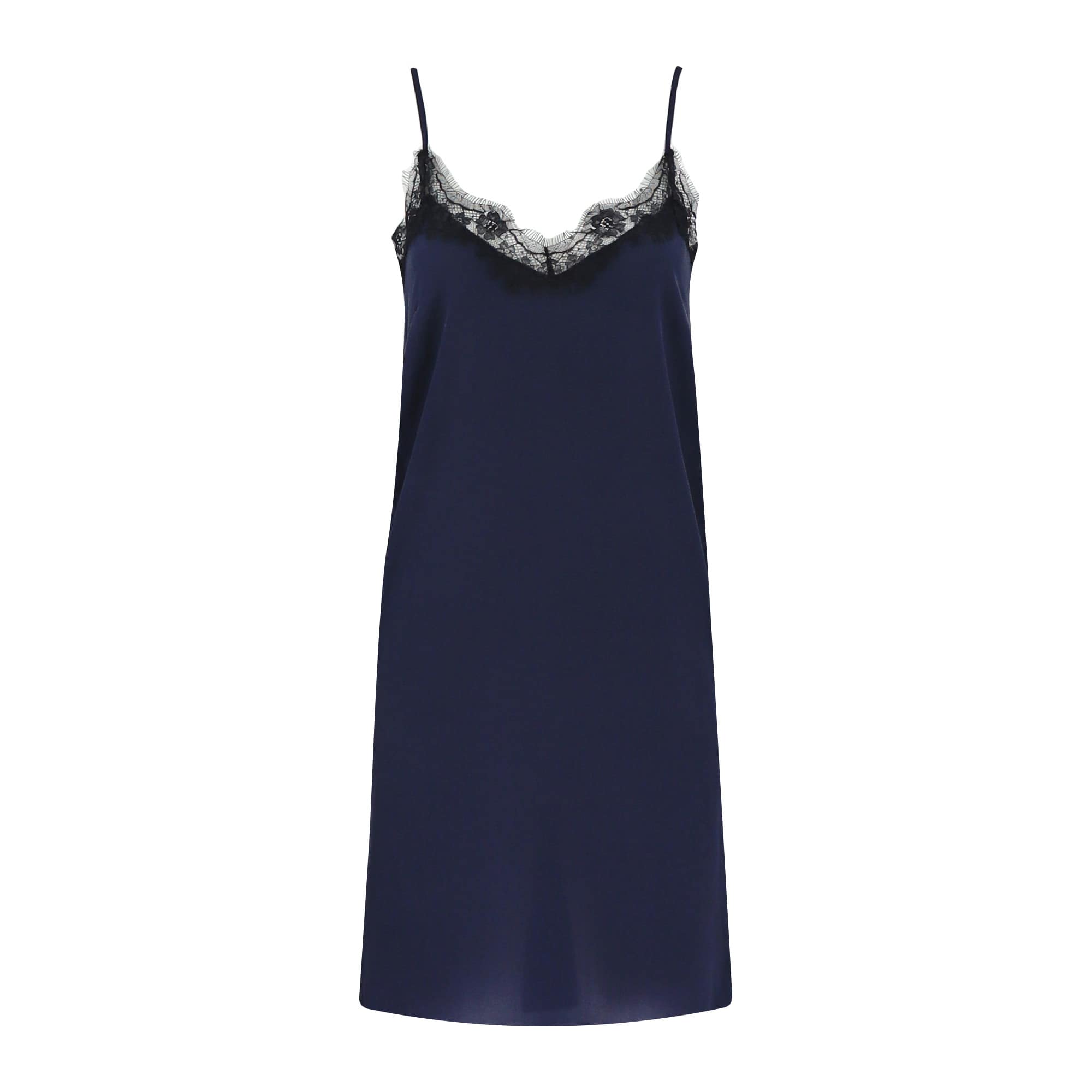 Kort, zijden kleedje van Princess goes Hollywood. Deze jurk is gemaakt van donkerblauw zijde met een kanten afwerking in de hals. De jurk valt kort, heeft een V-hals en twee verstelbare spaghetti bandjes.