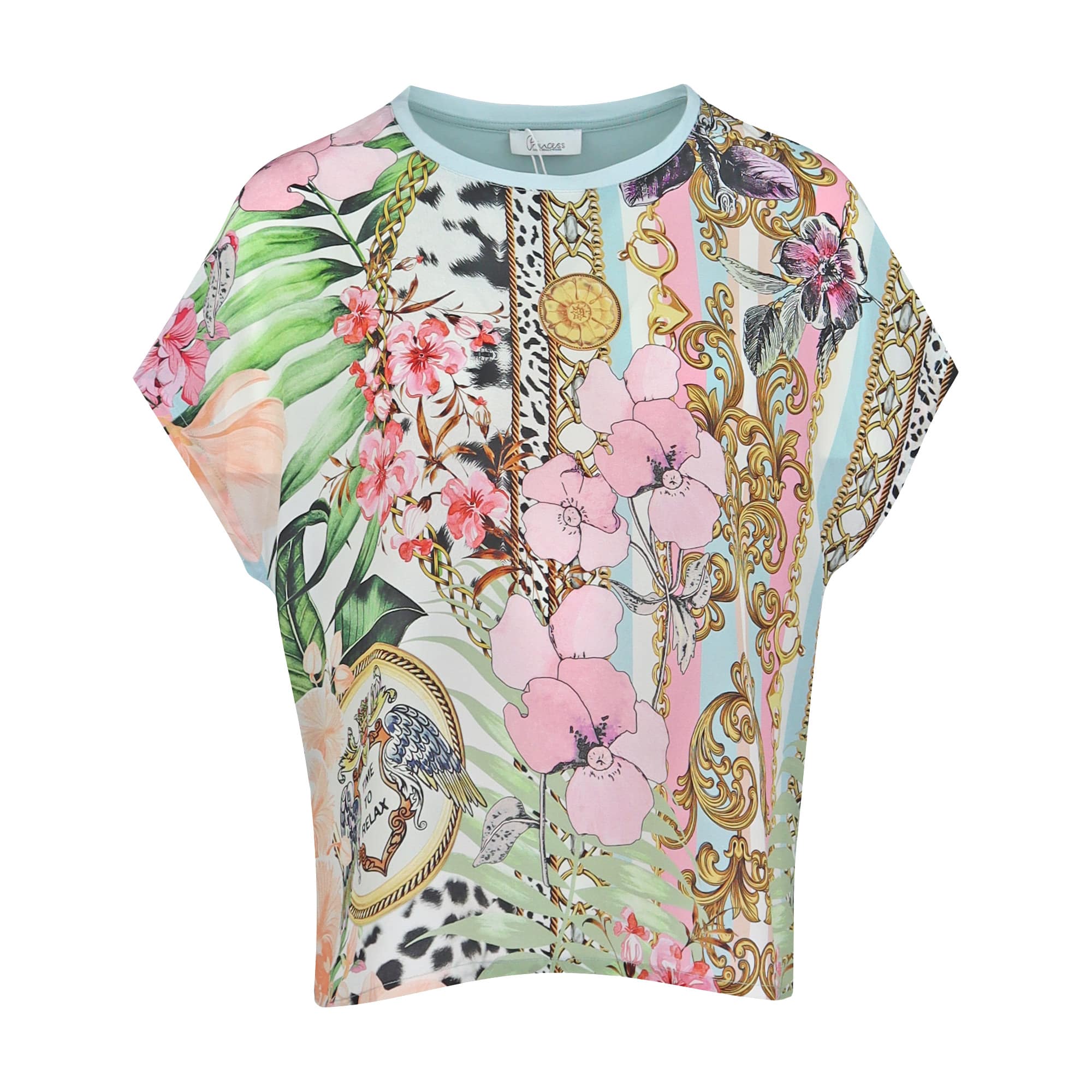 Barok t-shirt van Princess goes Hollywood, model silk leo shirt in fantasy print. Dit t-shirt is aan de voorzijde gemaakt van zijde en heeft een effen lichtblauwe achterzijde dat gemaakt is van viscose. Aan de voorzijde heeft het shirt een barokke print met bloemen. Het shirt heeft een ronde hals, kapmouwtjes en een losvallende pasvorm.