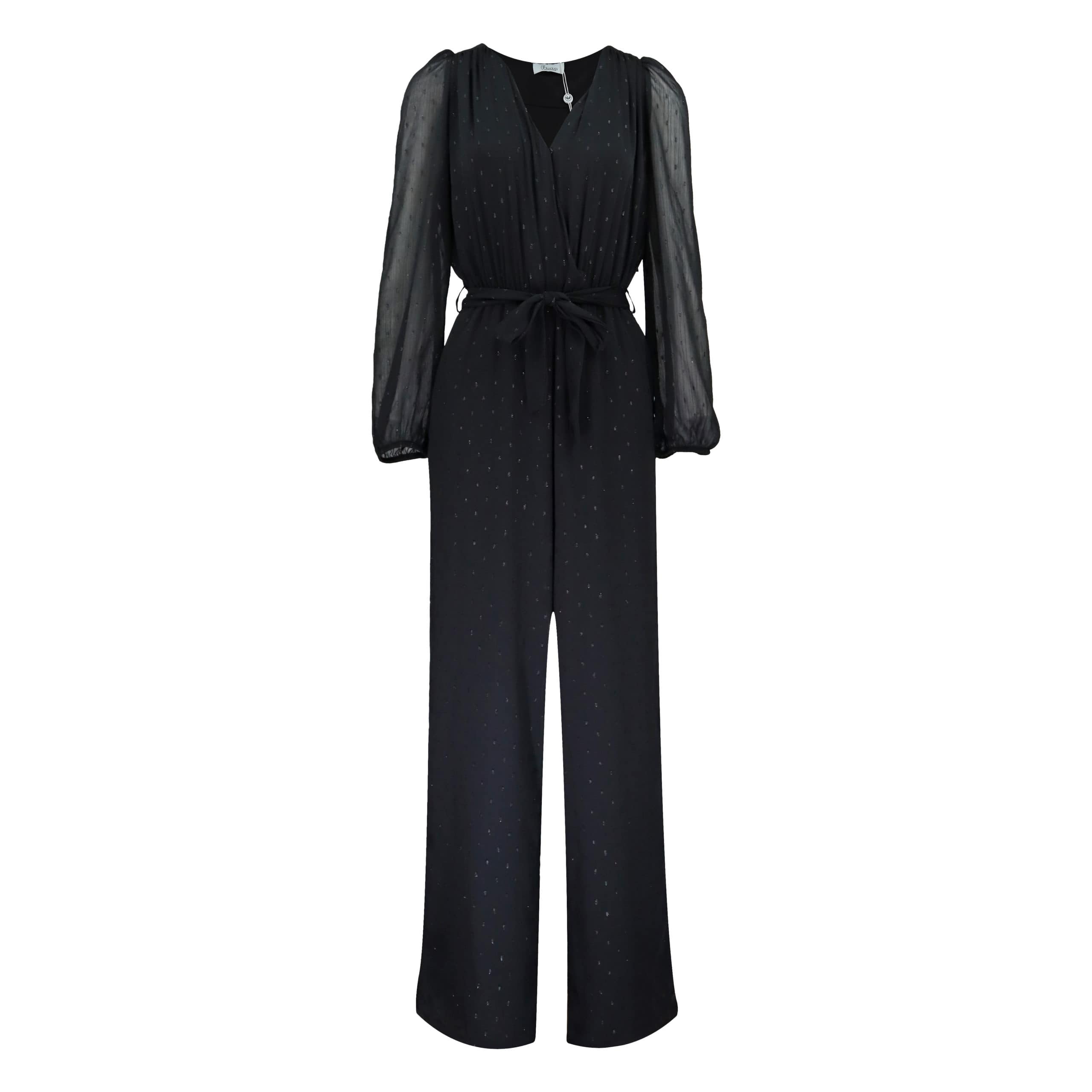 Zwarte jumpsuit van Princess goes Hollywood, model loose jumpsuit. Deze jumpsuit is gemaakt van een zwarte doorschijnende stof met zwarte dots en is gevoerd met zwarte stof, waardoor alleen de mouwen doorschijnend zijn. De jumpsuit heeft een elastische taille, lange mouwen, twee steekzakken, v-hals en rechte wijde broekspijpen.