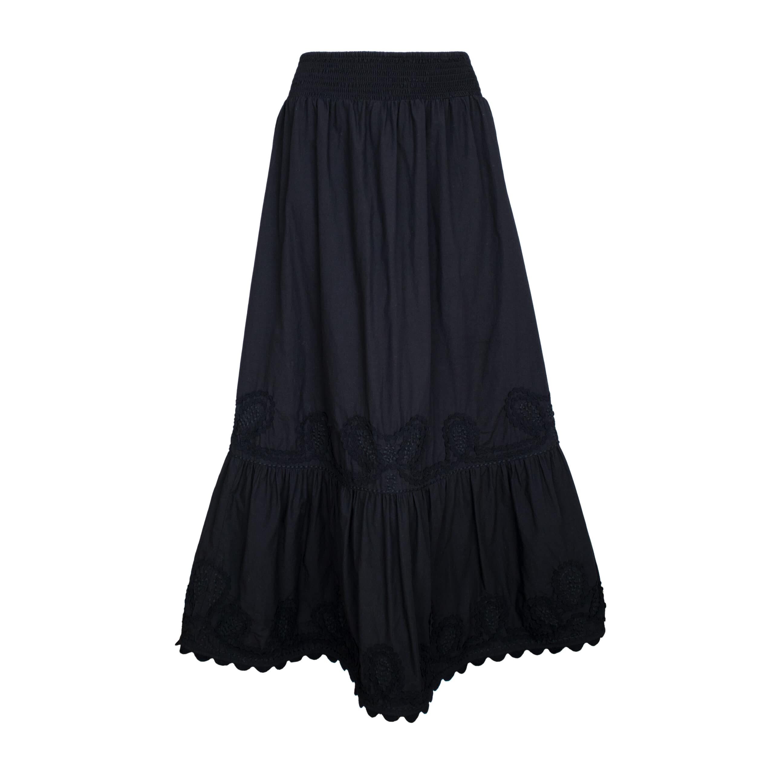 Zwarte maxi rok van Princess goes Hollywood. Deze maxi rok is gemaakt van katoen en heeft volant die bezet is met zwart kant. De rok heeft een gesmockte, elastische taille en valt lang.