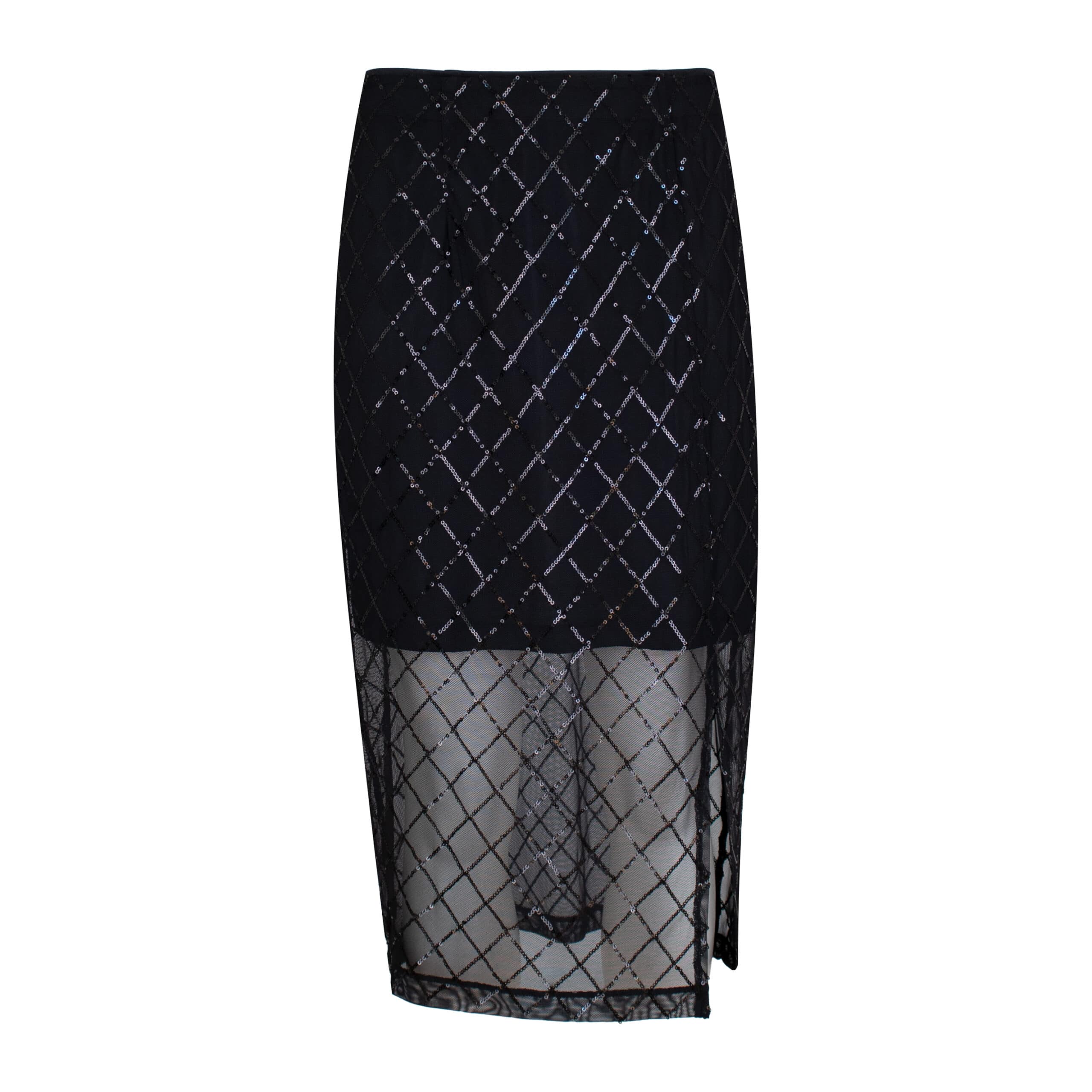 Zwarte midi rok van Princess goes Hollywood, model sequences skirt in nero. Deze zwarte rok heeft een korte onderrok met een doorschijnende bovenlaag die in een geruit patroon bezet is met pailletten. De rok heeft een split aan de zijkant, heeft een elastische taille en valt op de kuiten.