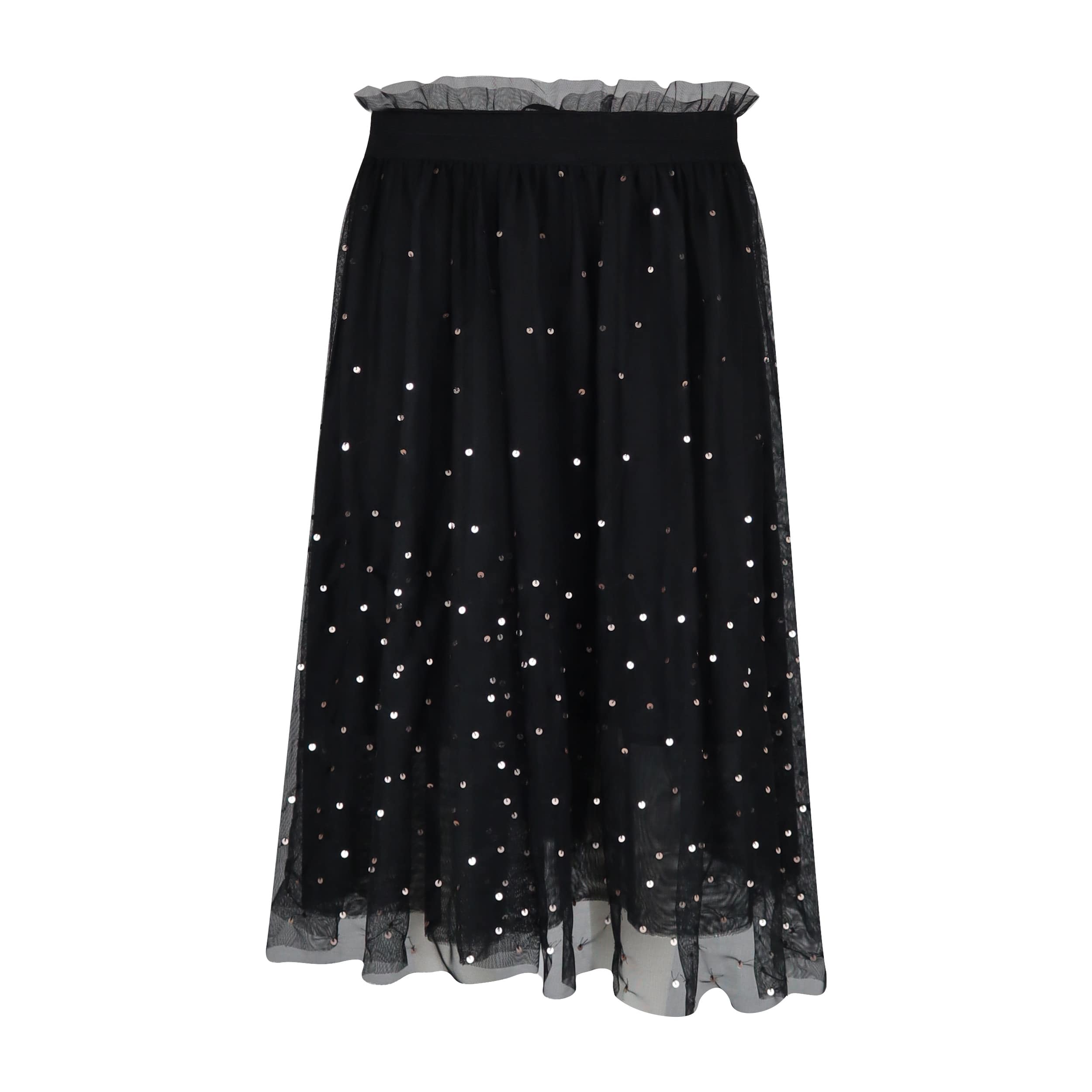 Zwarte midi rok van Princess goes Hollywood. Deze zwarte rok is gevoerd en heeft een tule bovenlaag met hierop goudkleurige pailletten. De midi rok heeft een elastische taille en valt tot onder de knie.