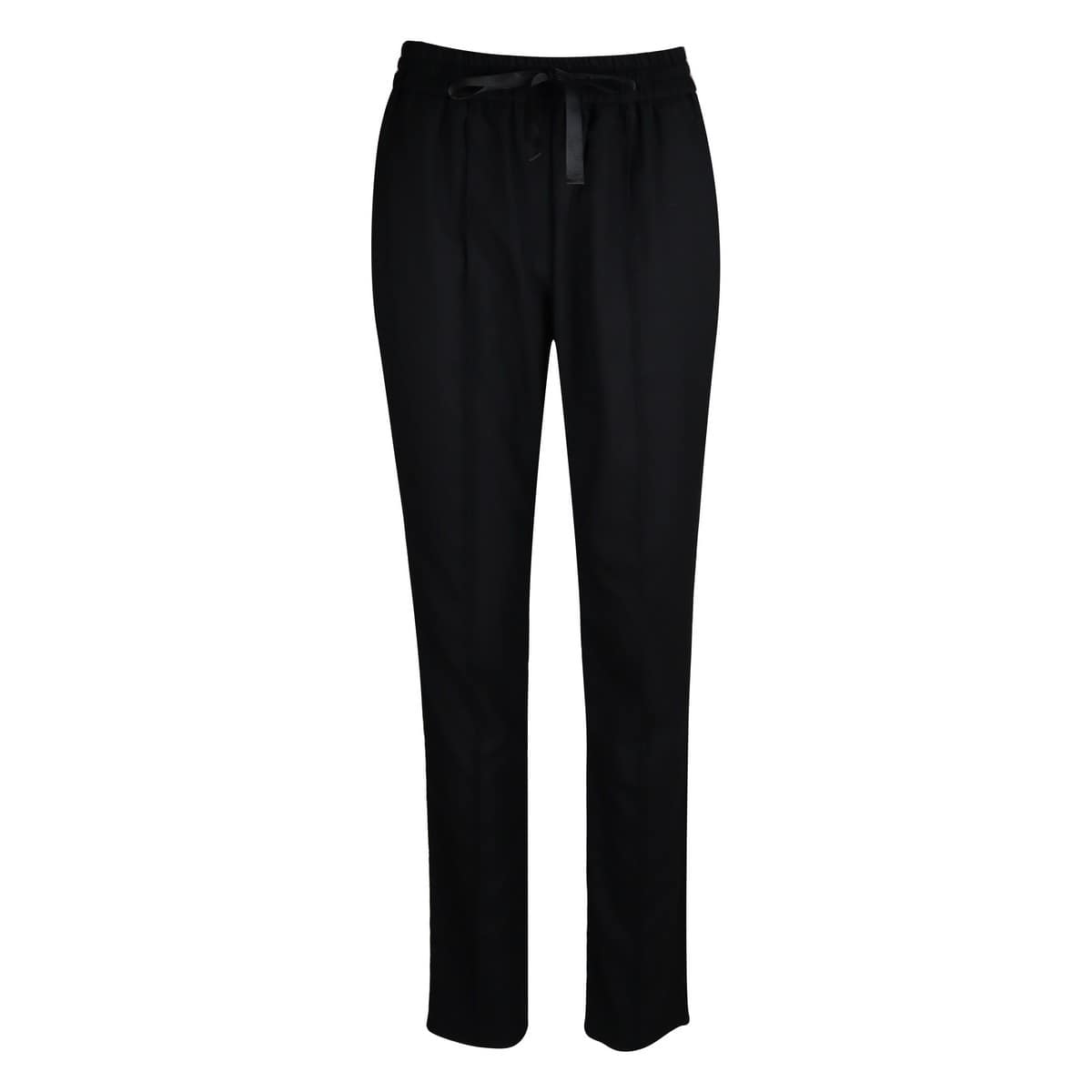 Zwarte pantalon van Princess goes Hollywood. Deze broek is gemaakt van een soepel vallende zwarte stof gemaakt van een wol mix en heeft een vaste naad aan de voorzijde. De pantalon heeft een elastische taille met treklint, twee steekzakken en twee achterzakken.