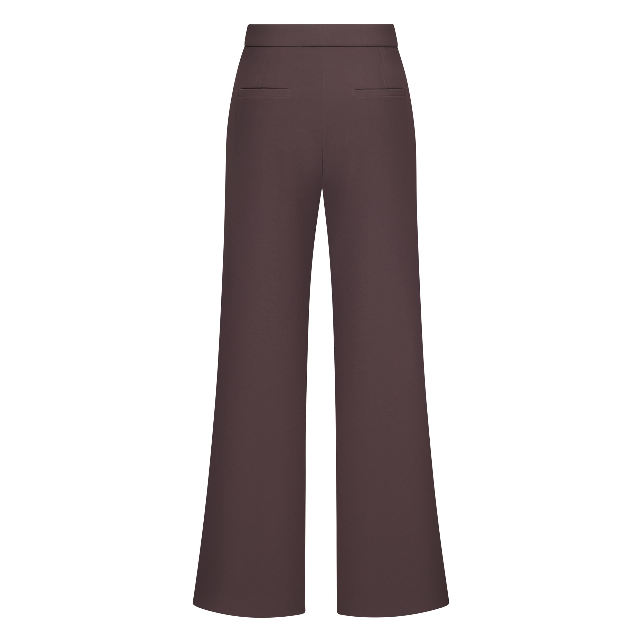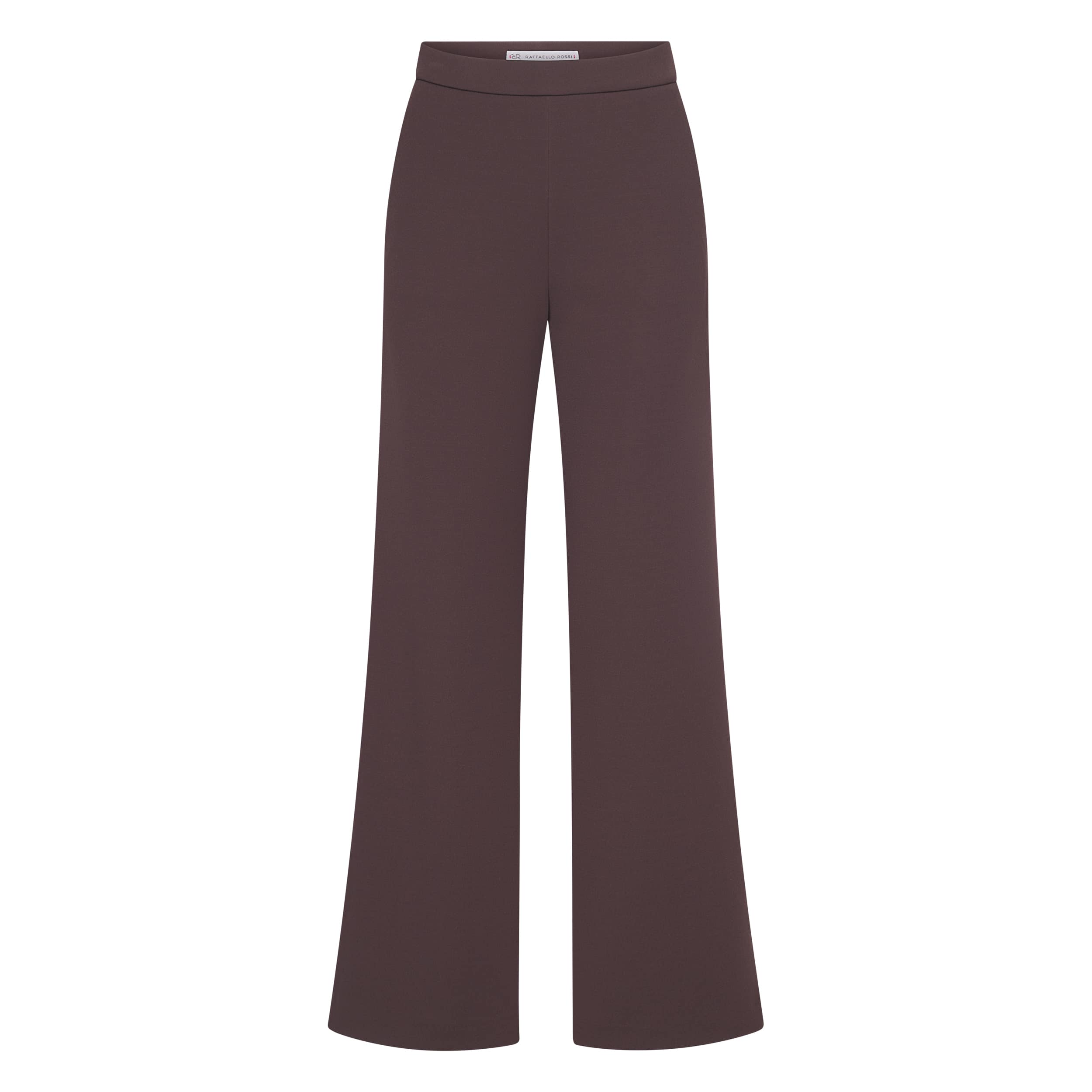 Bruine pantalon van Raffaello Rossi, model Palina Long in dark chocolate. Deze pantalon is gemaakt van een bruine stretch stof en heeft wijde, rechte broekspijpen. De broek heeft een elastische taille en een hoge taille.