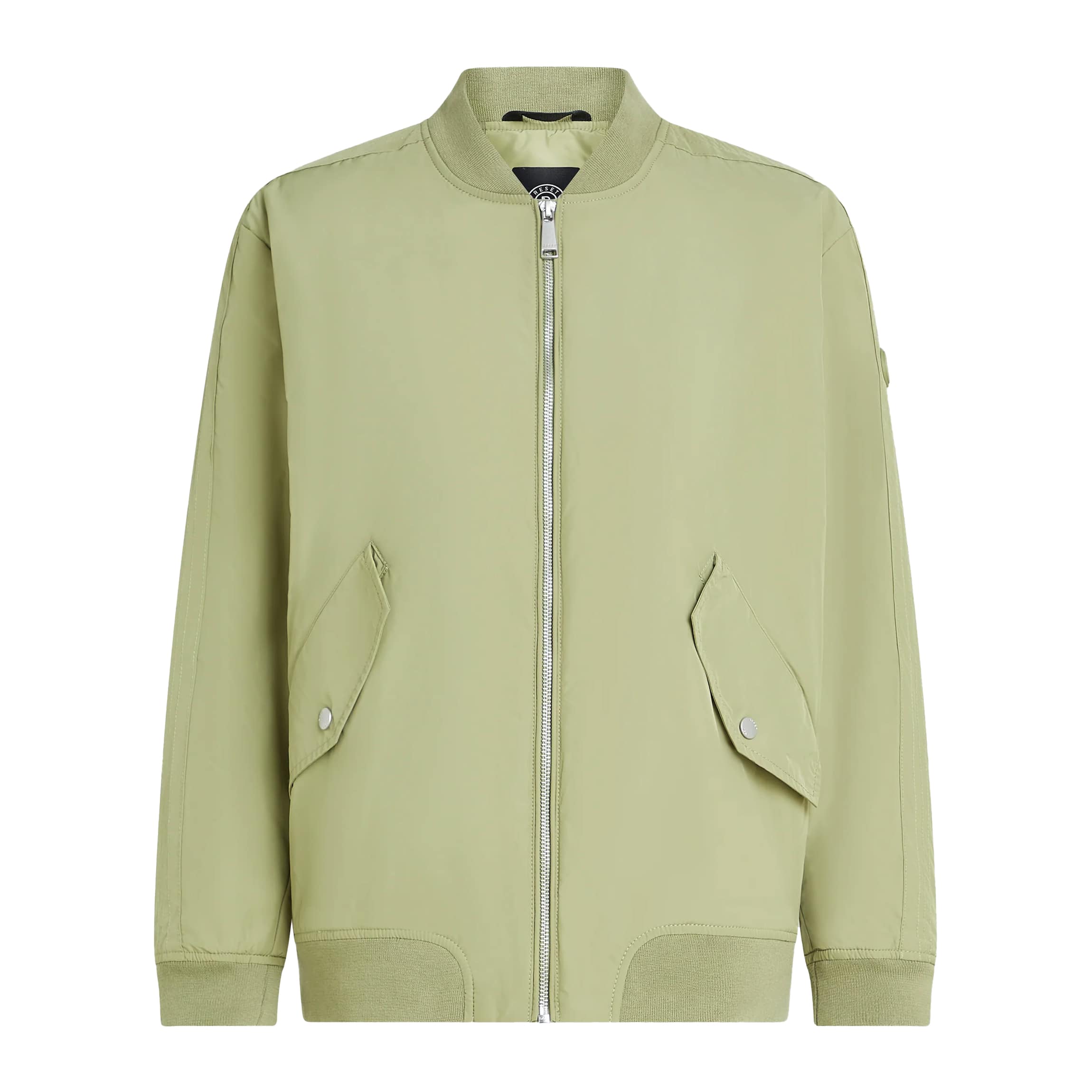 Groene bomberjas van Reset, model Gioia in light green. Deze jas is lichtgevoerd en sluit met een ritssluiting aan de voorzijde. De jas heeft twee klepzakken met een drukknoop, een binnenzak met een rits en ritsen in de zijnaad.