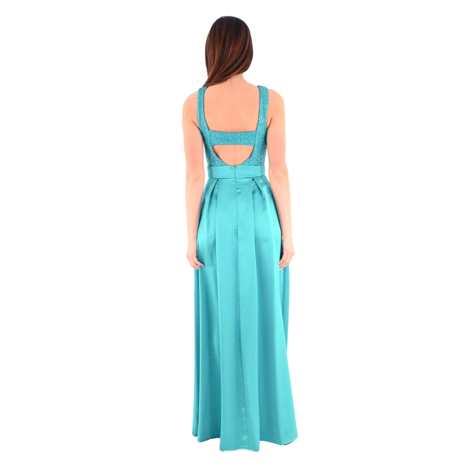 Lang kleedje van Rinascimento, model abito donna verde pavone. Deze maxi jurk is gemaakt van een pauw groene satijnen stof en heeft een body die bezet is met pailletten. De avondjurk heeft gekruiste banden aan de hals met een keyhole aan de voorzijde. Aan de achterzijde heeft de jurk een open rug met een band ten hoogte van de onderzijde van de schouderbladen en een verborgen ritssluiting.