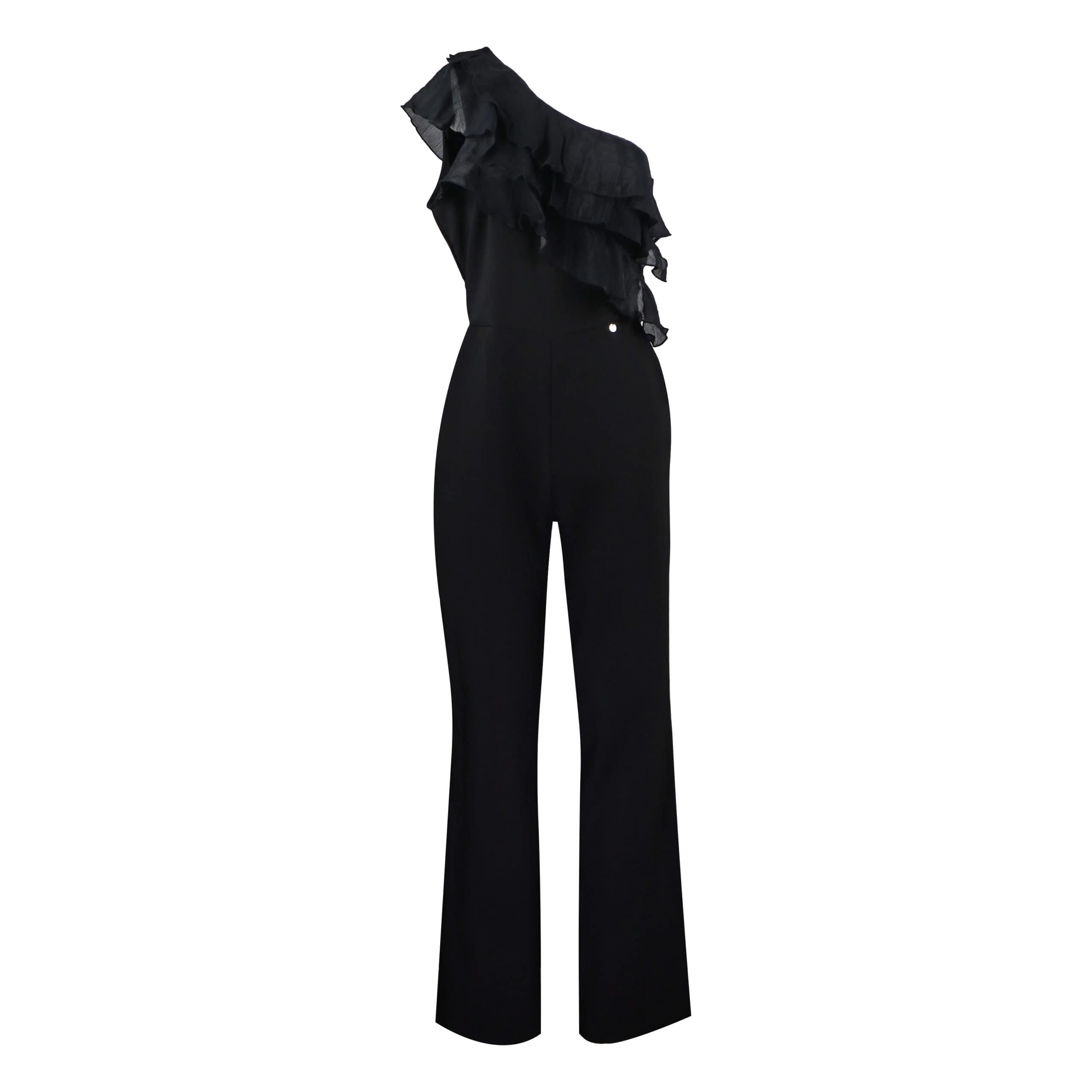 Zwarte jumpsuit van Rinascimento. Deze getailleerde jumpsuit heeft een body met aan een zijde een open schouder met ruches. De effen zwarte jumpsuit heeft wijde broekspijpen, twee steekzakken en sluit met een verborgen ritssluiting aan de zijkant.