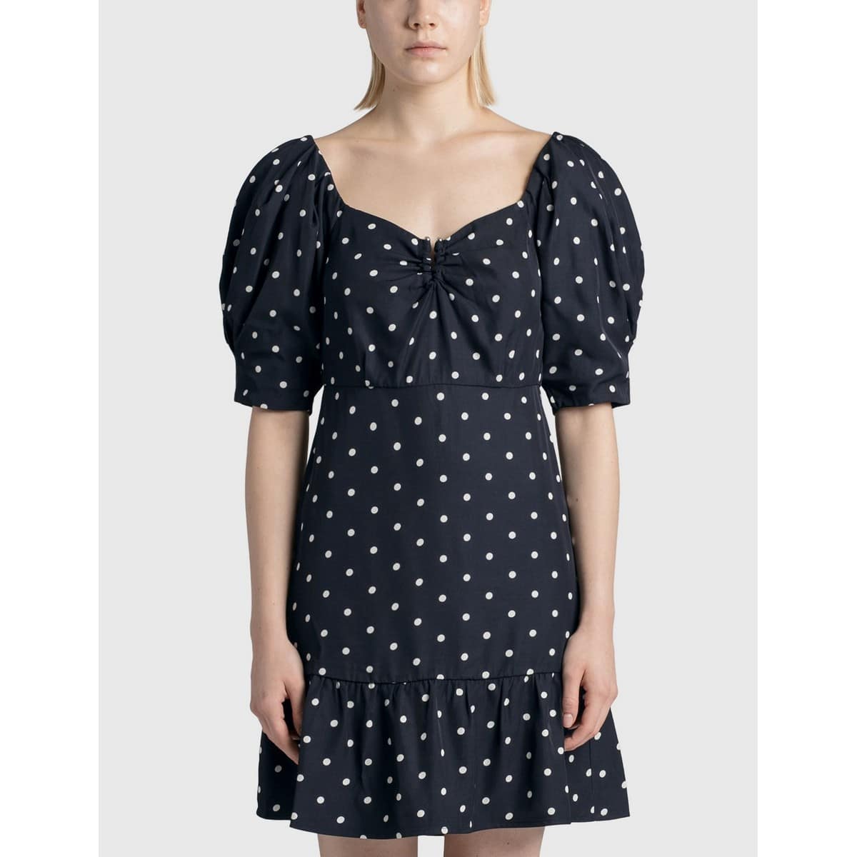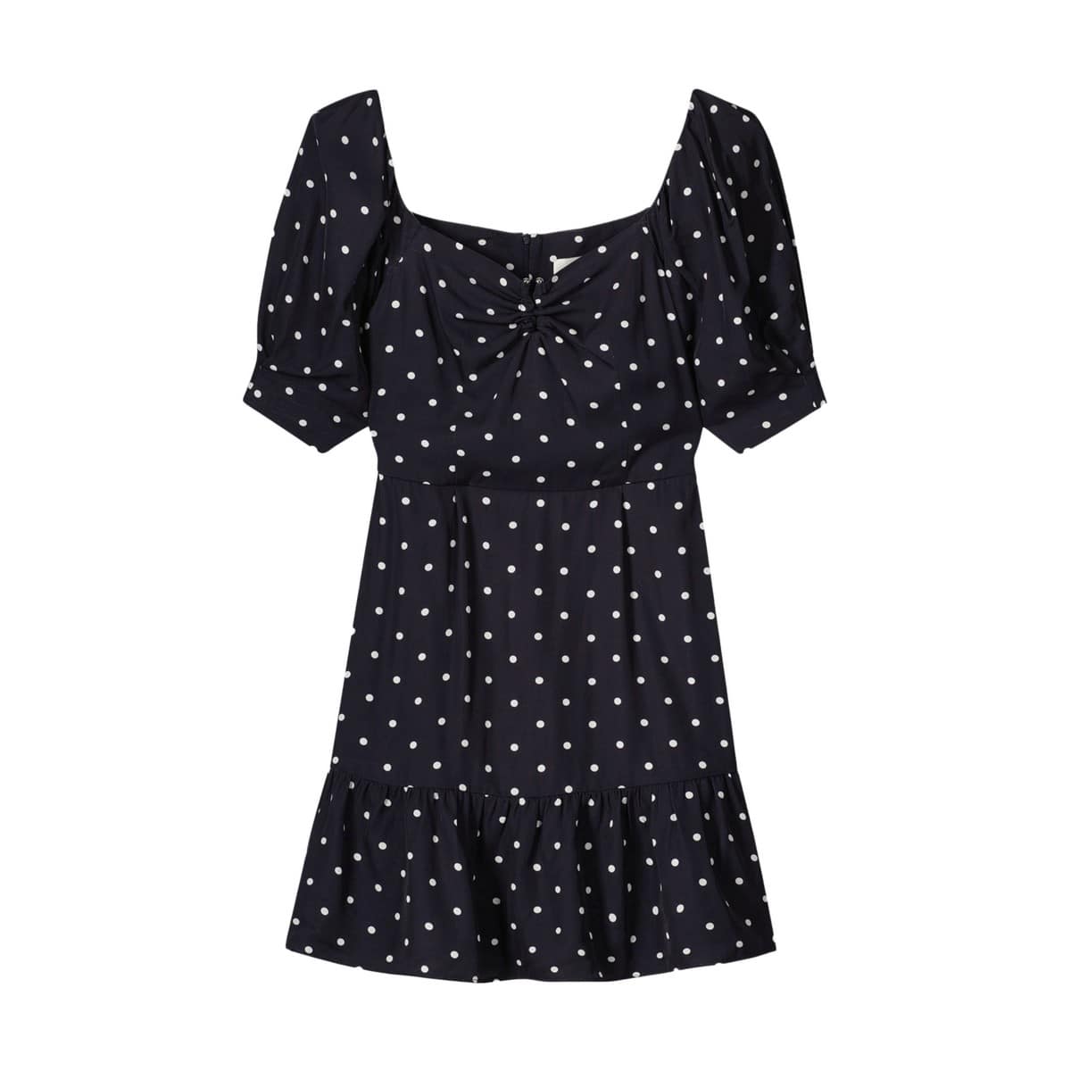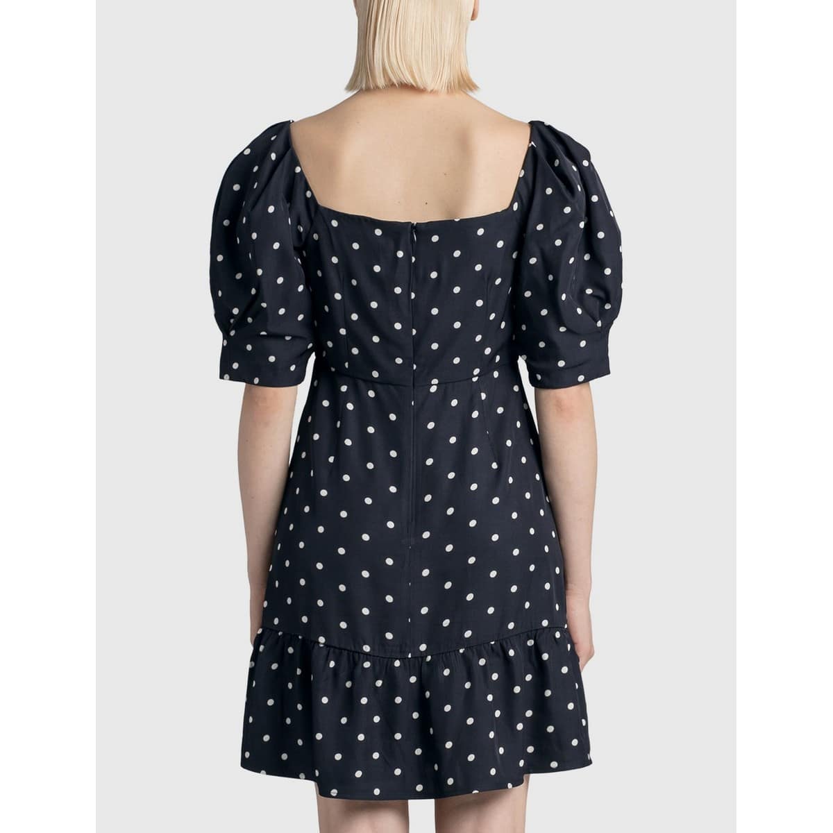 Donkerblauwe jurk van Róhe, model Margarita. Deze korte jurk heeft een donkerblauwe basis met een all over print met witte polkadots. De jurk heeft korte plooi mouwtjes met een rechte hals, verborgen ritssluiting aan de achterzijde en volants aan de zoom.