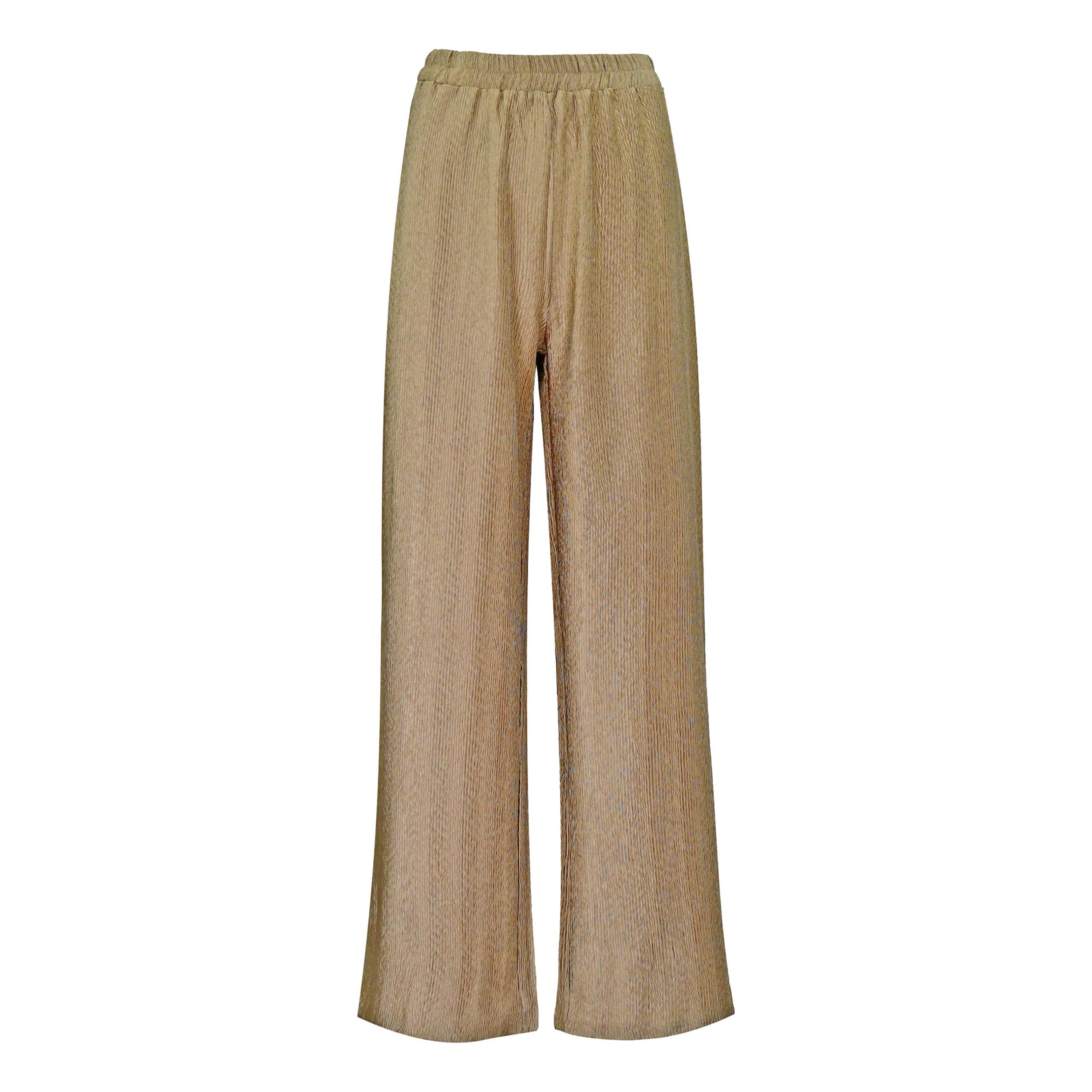 Wijde pantalon van Rut & Circle, model Madison. Deze rechte broek is gemaakt van een goudkleurige relief stof en heeft een losvallende pasvorm. De pantalon heeft een hoge elastische taille.
