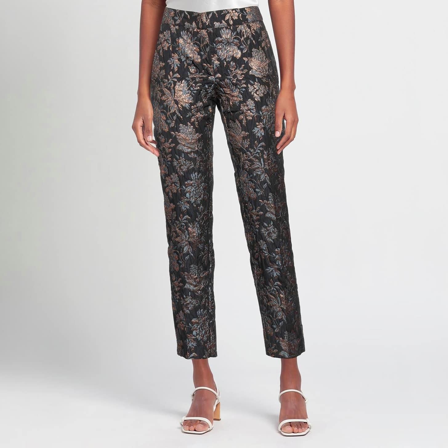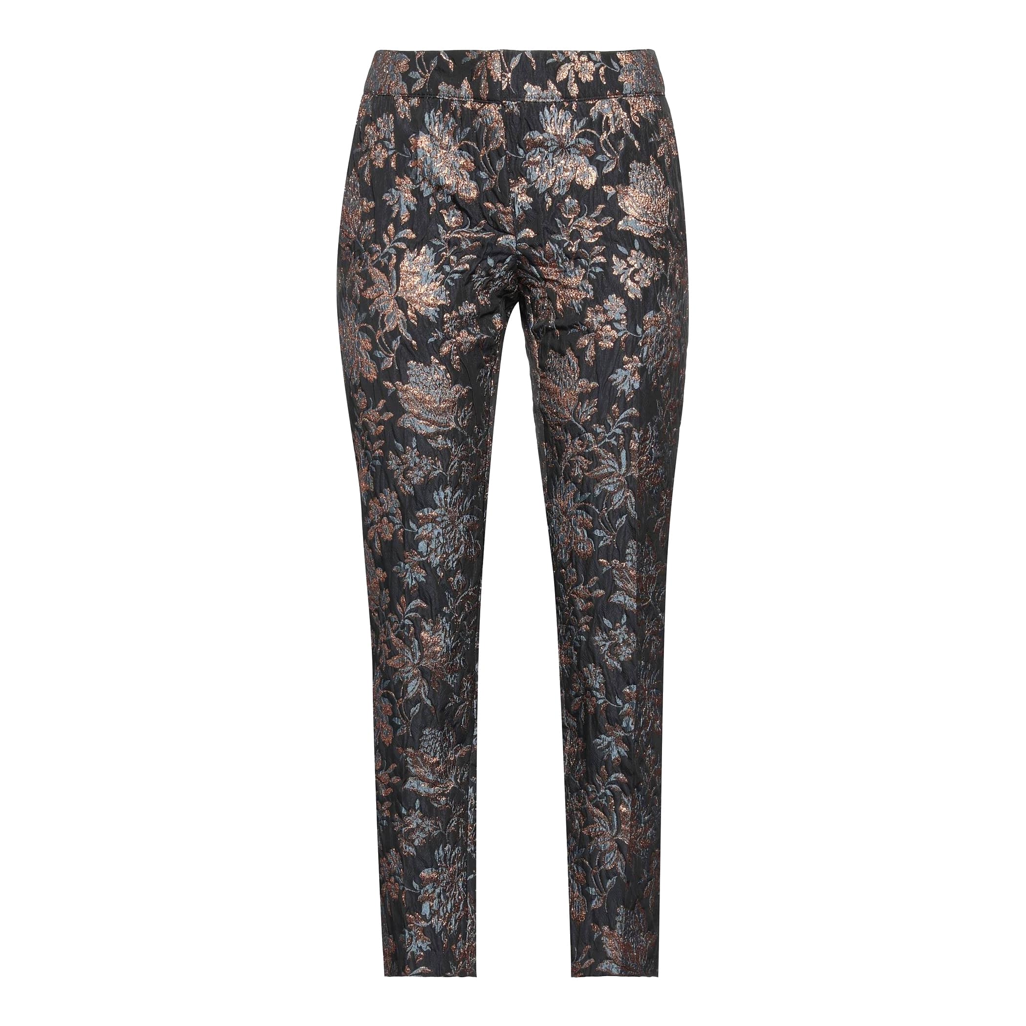 Donkerblauwe pantalon van Semicouture in brocatto blu. Deze broek is gemaakt van een stevige donkerblauwe jacquard stof met structuur waar in metalic draad bloemen op geborduurd zijn. De pantalon sluit met een haakje, knoop- en ritssluiting, heeft twee steekzakken en sier paspelzakjes.