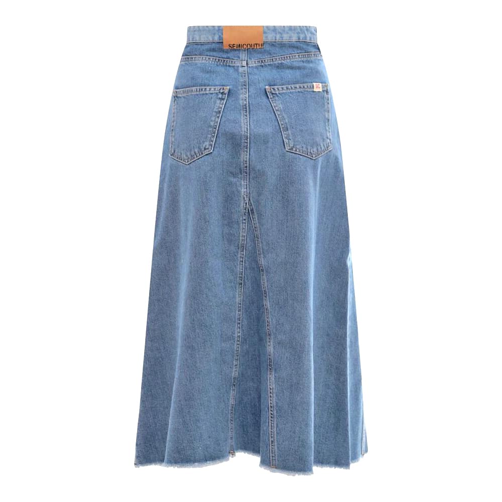Lange denim rok van Semicouture. Deze blauwe midi rok is gemaakt van twee kleuren denim stof, sluit met een knoop- en ritssluiting en heeft twee steekzakken en twee achterzakken. De spijkerrok heeft een een uitlopende pasvorm met aan de zoom fijne rafels en valt tot onder de knie.