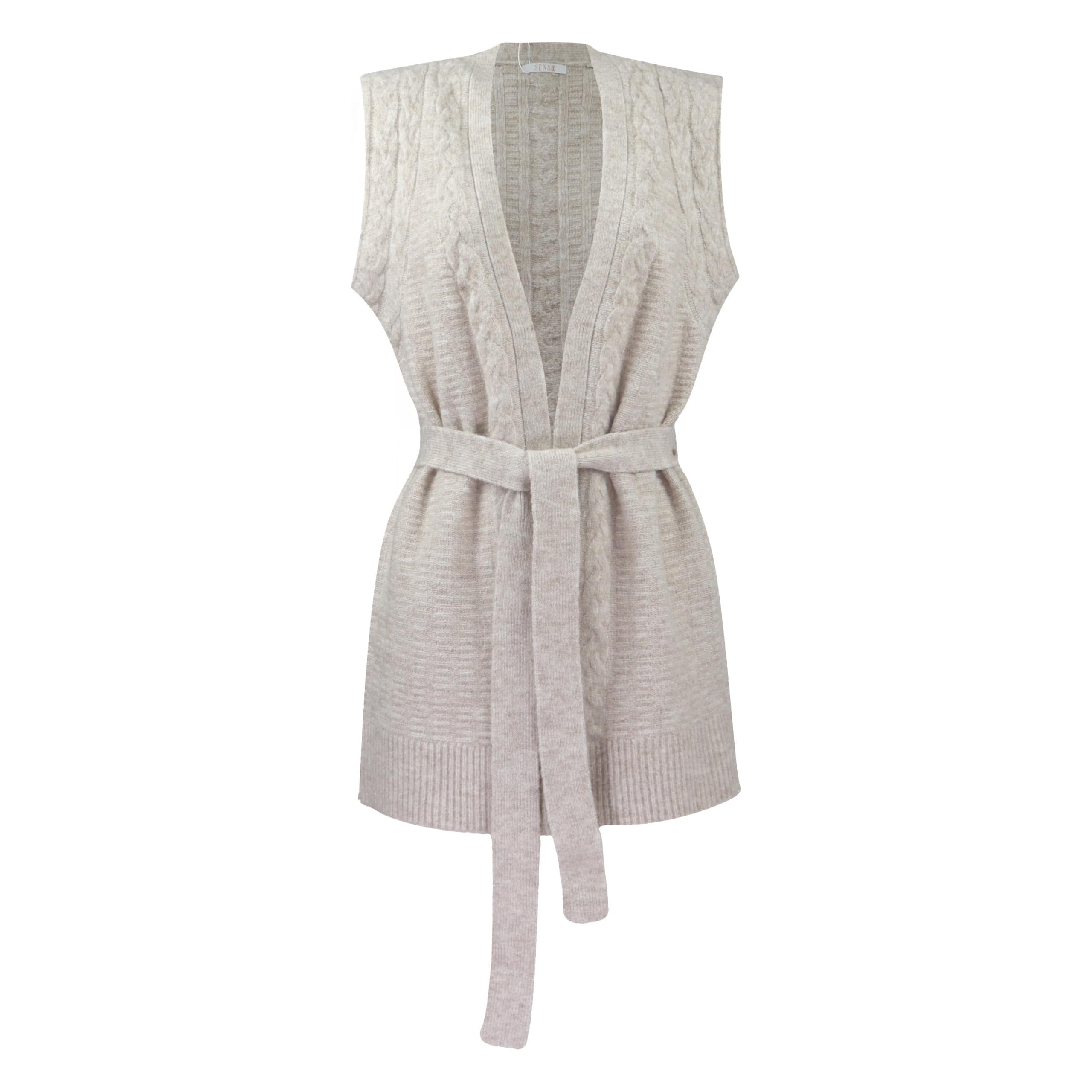 Beige cardigan van Senso, model Zira. Dit mouwloze vest heeft een open voorzijde en sluit met een bijpassende ceintuur. Het vest is fijn gebreid en heeft een kabel en fijne gestreept relief.