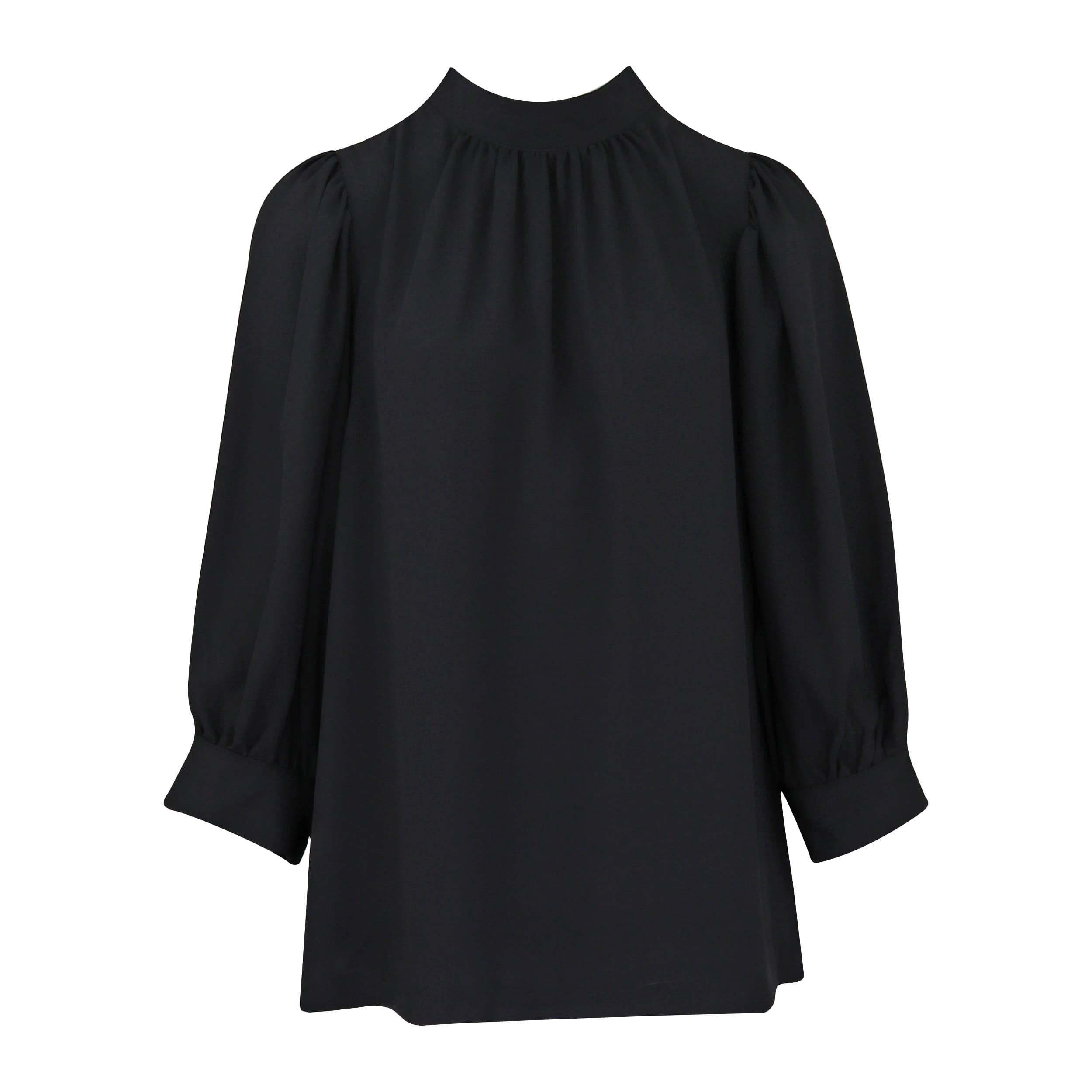 Zwarte blouse van Senso, model July. Deze los vallende blouse heeft een hogere ronde hals met elegante plooitjes. De mouwen hebben een licht pof effect doordat daar de plooitjes ook terugkomen. Aan de achterzijde sluit deze blouse met een verborgen ritssluiting.