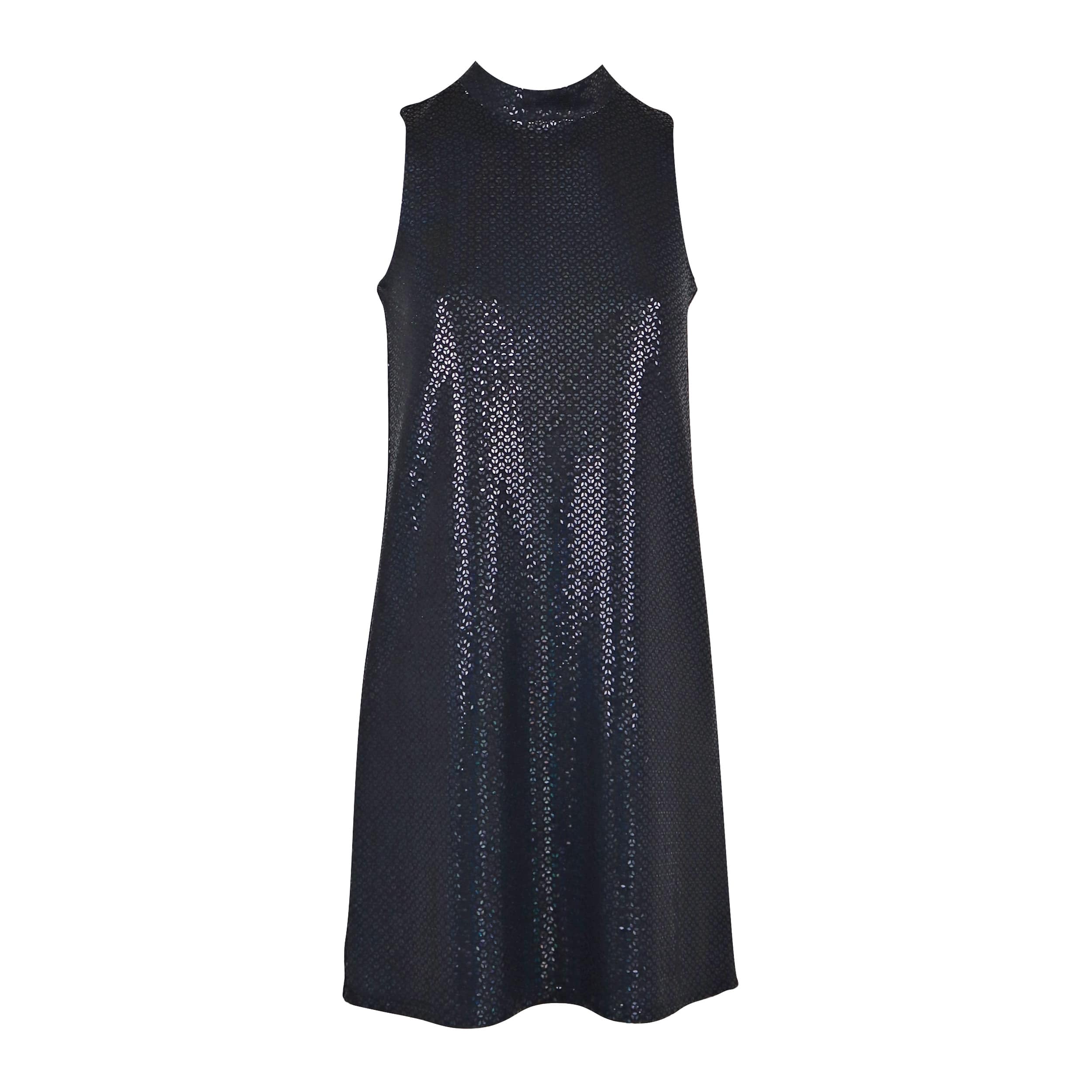 Zwart kleedje van Senso, model Edor in glam. Deze mouwloze jurk is gevoerd en geheel bezet met zwarte pailletten. De jurk sluit met een dubbele knoopsluiting in de hals, heeft een uitlopende pasvorm, hoge hals en valt boven de knie.
