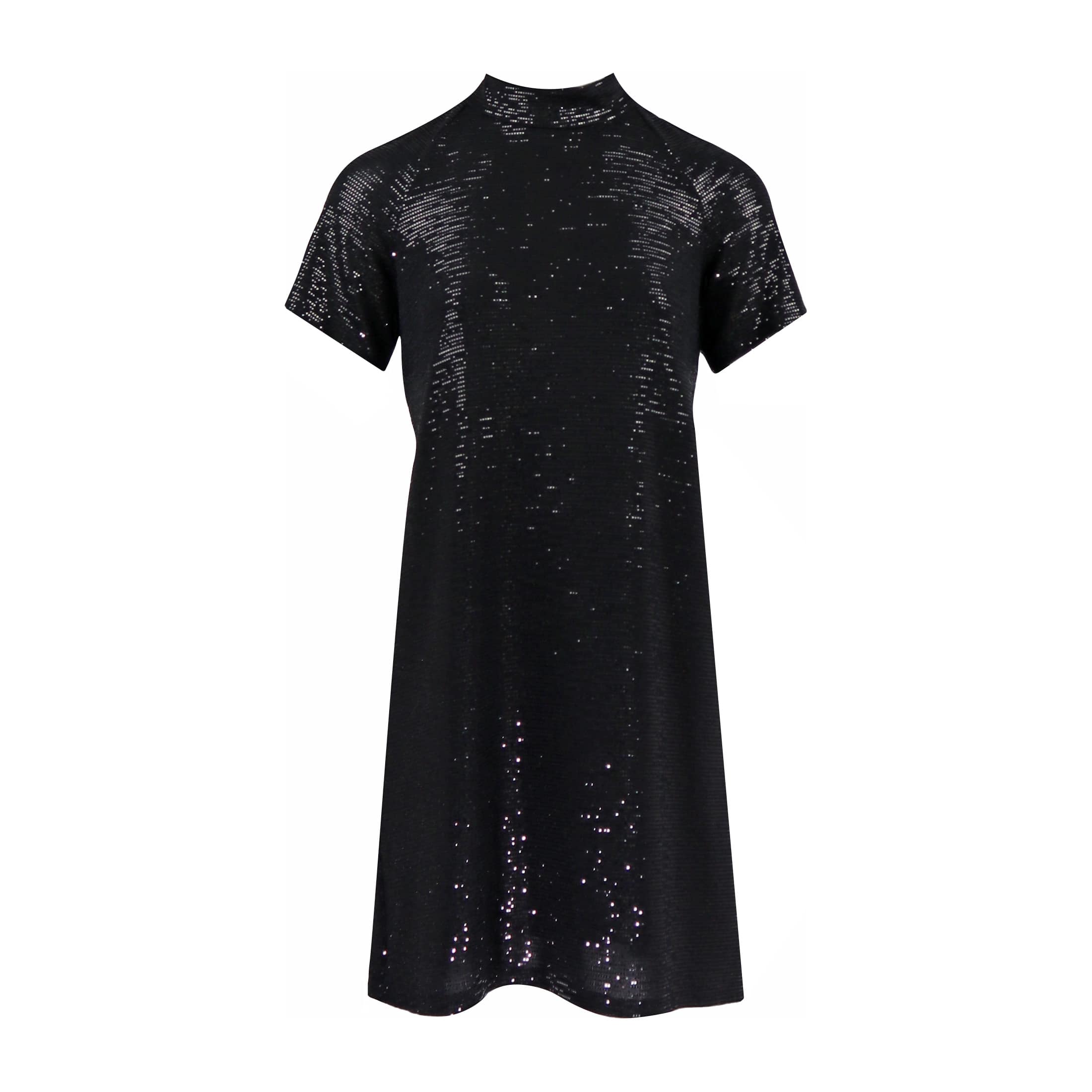Zwart kleedje van Senso, model Teore. Deze jurk is gemaakt van een zwarte stof met glimmertjes, sluit hoog in de hals en sluit aan de achterzijde met twee kleine knoopjes. De gevoerde jurk heeft een rechte pasvorm en valt boven de knie.