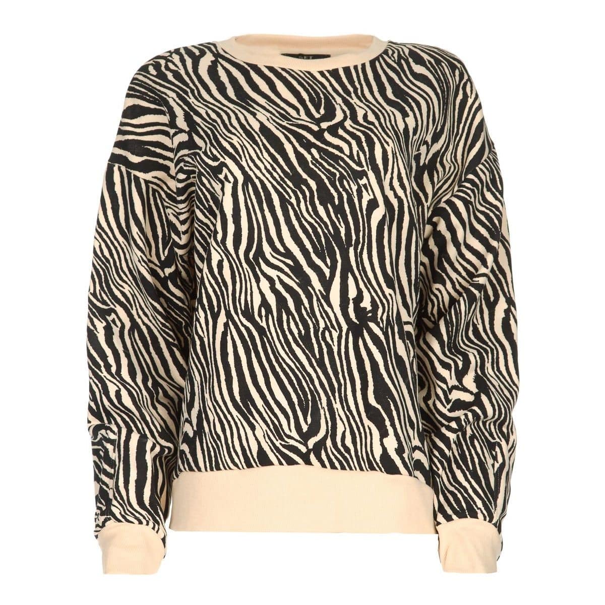 Beige pull met zebraprint van SET. Deze warme trui is gemaakt van katoen en heeft aan de binnenzijde een zacht fleece laagje. De trui heeft een losvallende pasvorm met een rode hals.