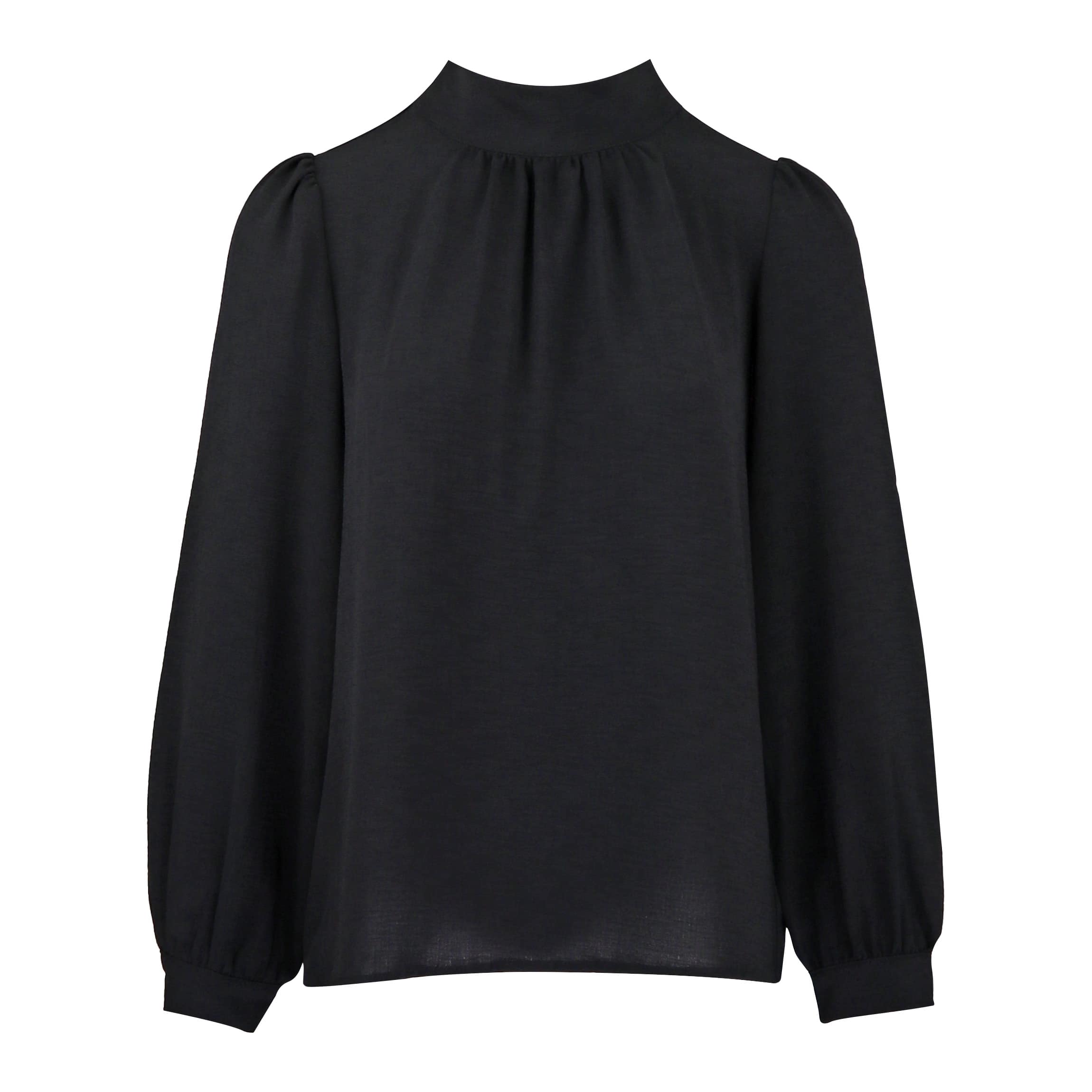 Zwarte blouse van Signe Nature. Deze blouse heeft een hogere ronde hals met elegante plooitjes die aan de achterzijde sluit met knoopjes met daaronder een keyhole. De mouwen hebben een licht pof effect, doordat daar de plooitjes ook terugkomen.