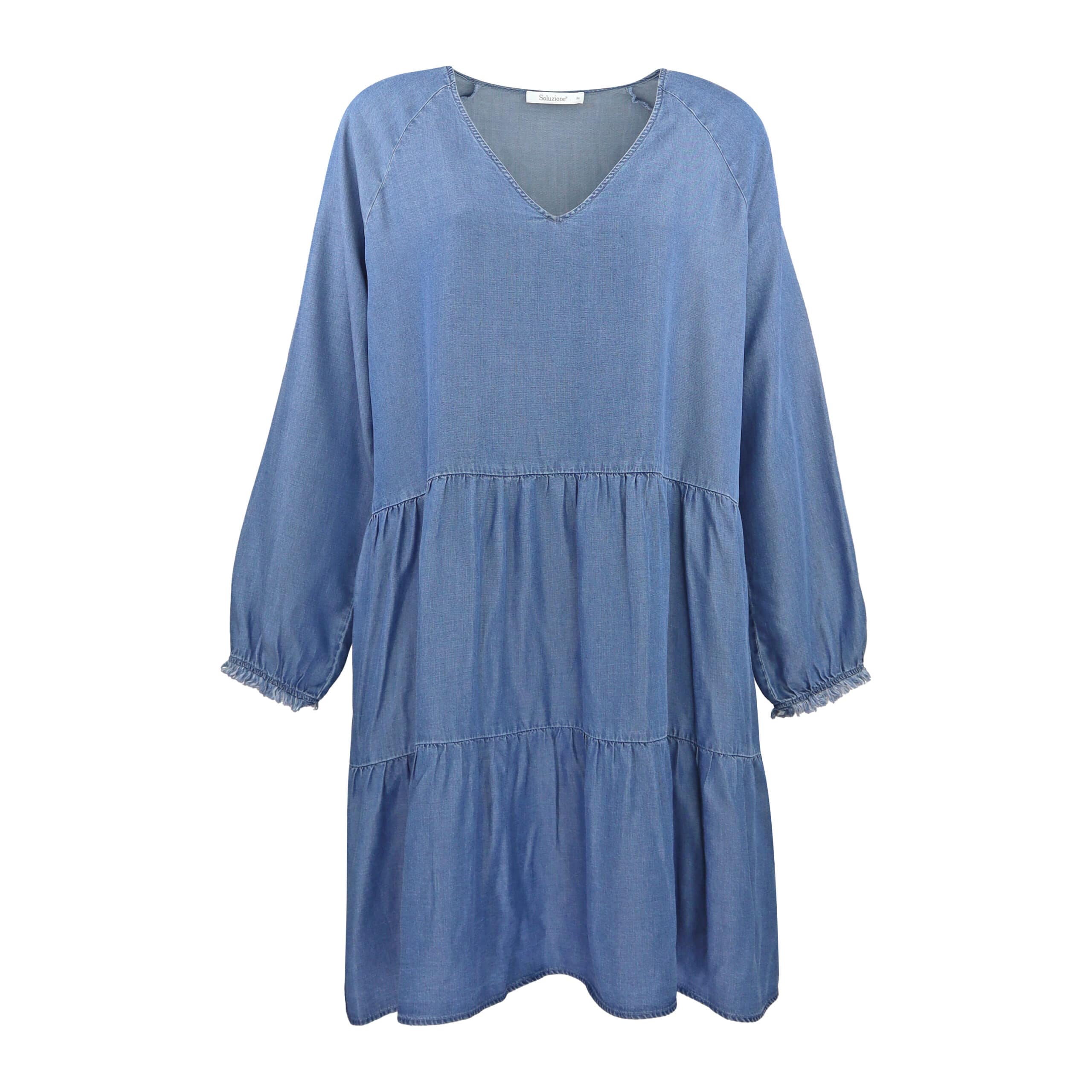 Denim look kleedje van Soluzione. Deze korte jurk is gemaakt van lyocell en heeft een losvallende, ruime pasvorm. De jurk heeft lange mouwen met fijngerafelde manchetten, V- hals en een uitlopende rok.