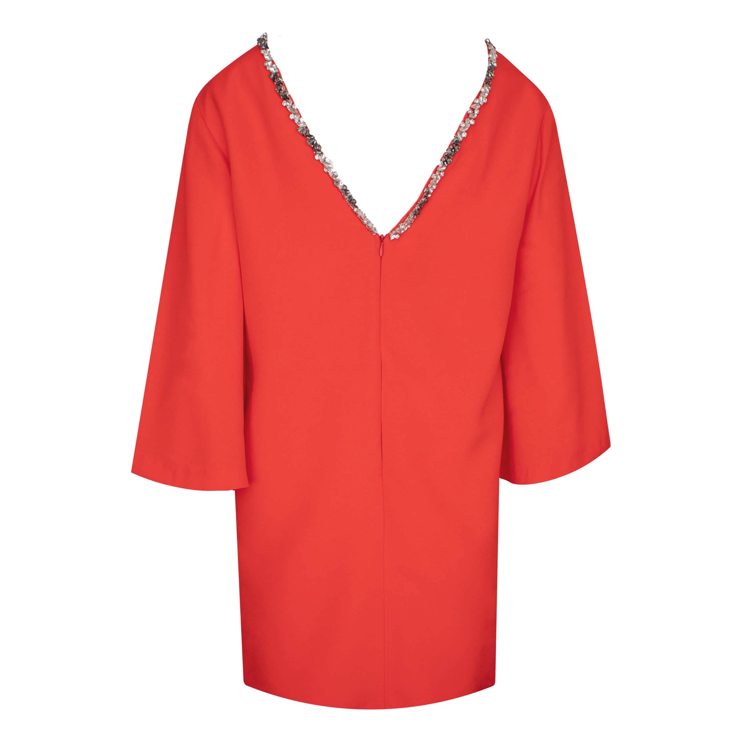 Rood kleedje van Spell by Access Fashion. Deze jurk is gemaakt van een effen rode stof en heeft een halslijn en V-vormige open rug die afgezet is met grijze en witte kralen. De jurk valt boven de knie, heeft een verborgen ritssluiting aan de achterzijde en een rechte pasvorm.