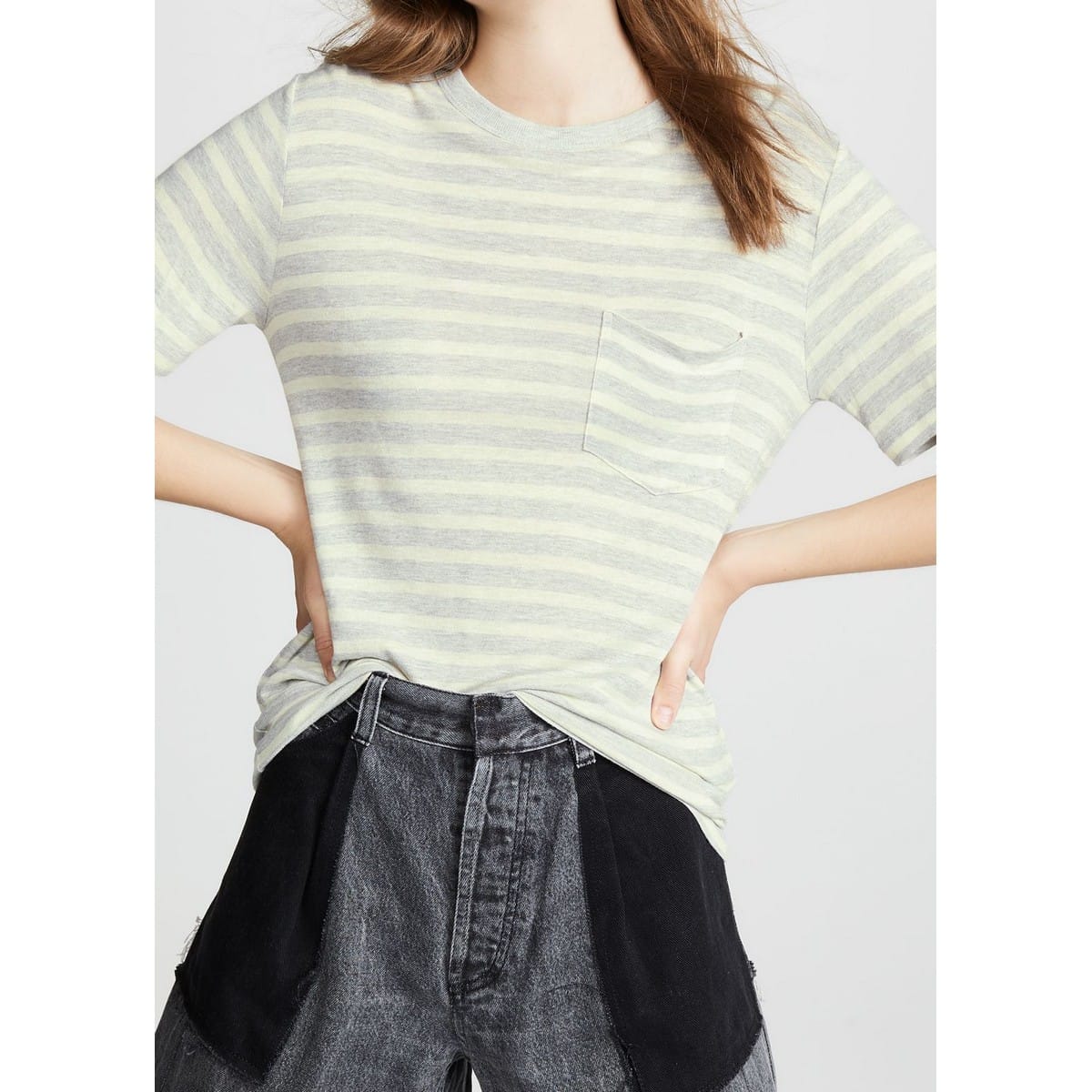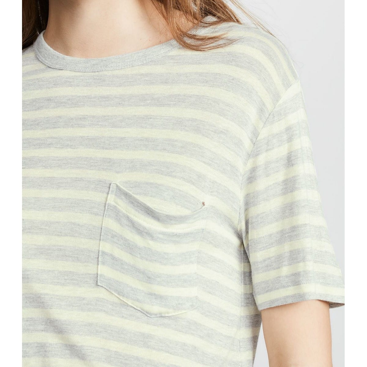 T-shirt met korte mouwen van T by Alexander Wang, model Wide Striped Slub Jersey Tee w/Pocket. Dit grijze t-shirt heeft lichtgele horizontale strepen met een grijs geribbelde hals. Het shirt heeft een ronde hals en borstzakje.