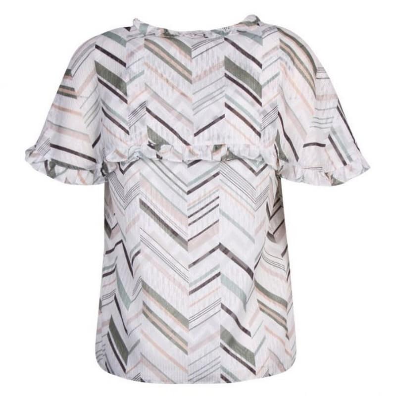 Gestreepte top van Ted Baker, model Altania. Deze top heeft een all-over schuine strepen print met een zilveren metalic draad. De hals, korte mouwen en voor op de borst heeft de top kleine ruches. Deze lopen ook door aan de achterzijde.