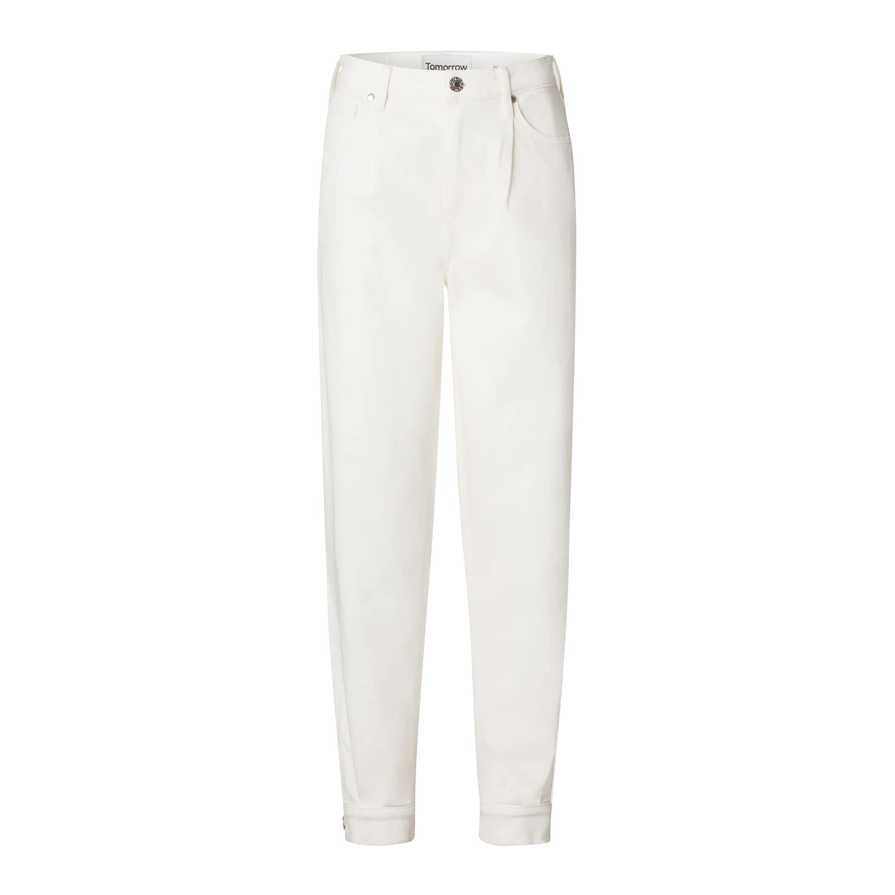 Ecru jeans van Tomorrow, model Bill jeans wash ecru. Deze denim broek heeft een hoge taille, loose fit, cropped leg en je kunt de onderzijde van de broekspijpen met een drukknoop sluiten. De jeans sluit met een knoop- en ritssluiting, heeft twee steekzakken en twee achterzakken.