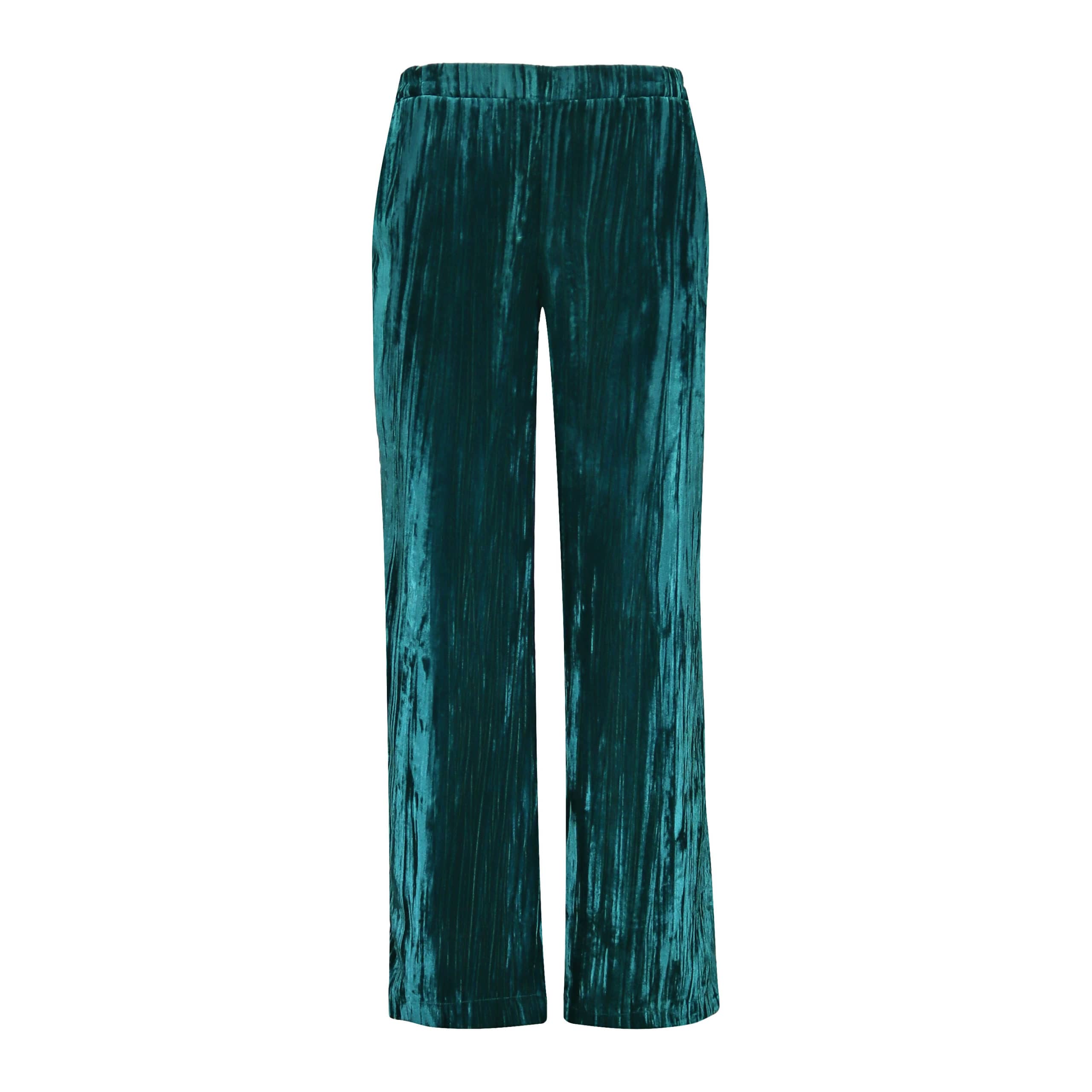 Groene fluwelen pantalon van Toupy, model Voltaire. Deze pantalon is gemaakt van een groene fluwelen stof met structuur en heeft lange rechte broekspijpen. De broek heeft aan de achterzijde een elastische taille en twee steekzakken.