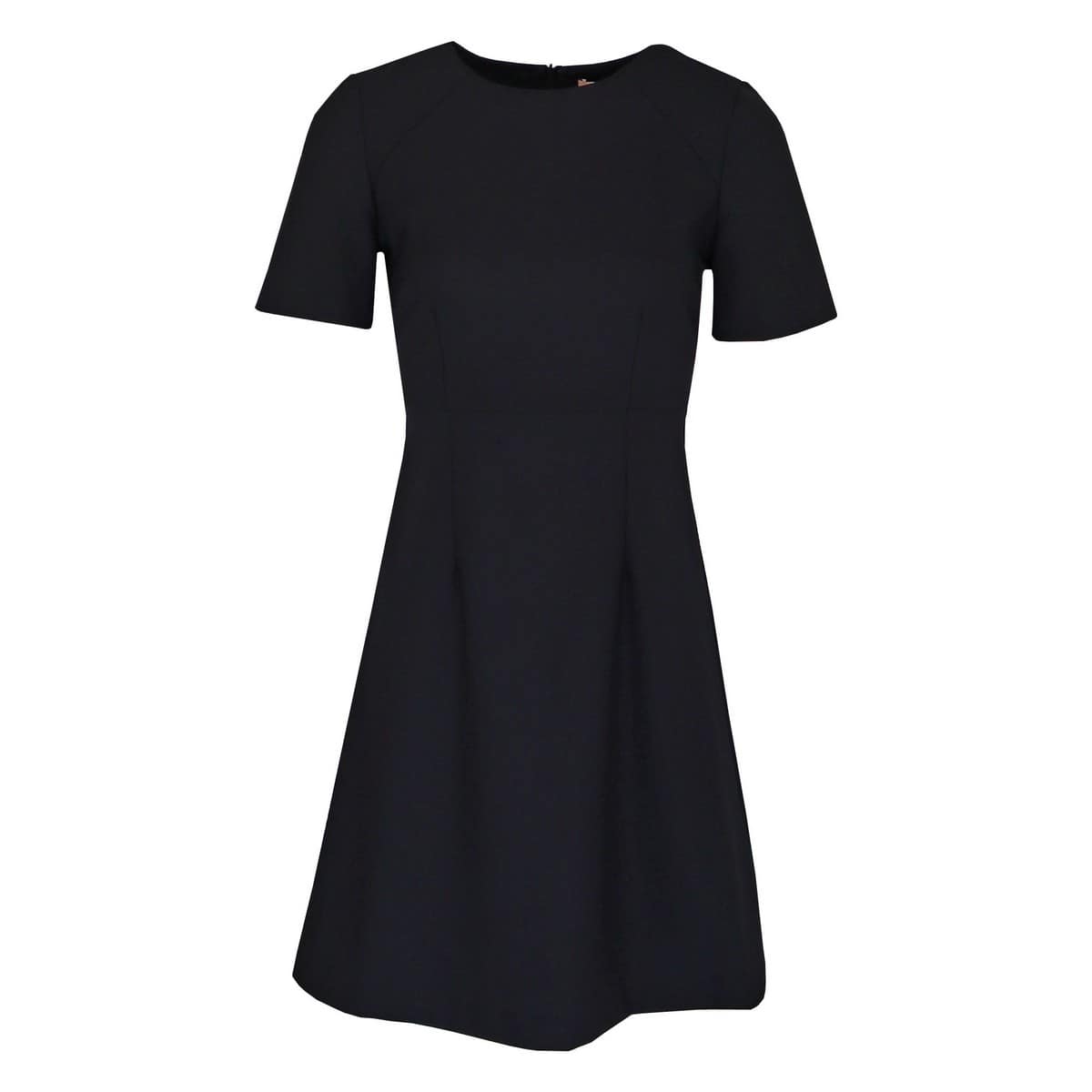 Wollen kleedje van Twinset. Deze zwarte jurk is gevoerd en heeft korte mouwen. De jurk is belijnd met het accent op de taille en sluit met een verborgen ritssluiting aan de achterzijde.