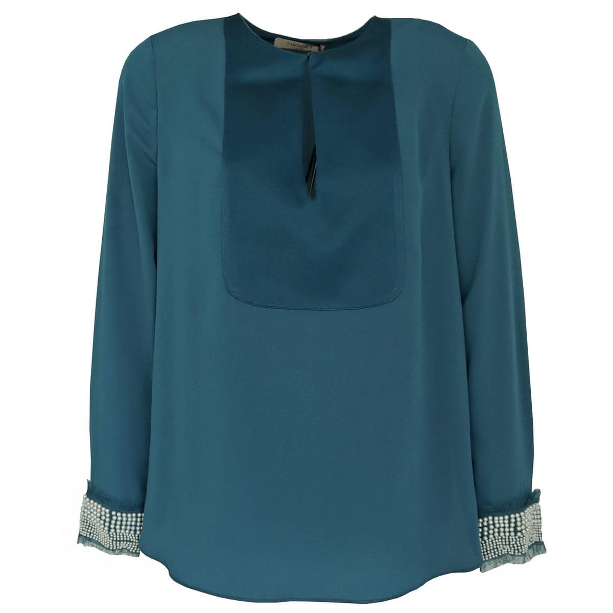 Caribbean blauwe blouse van Twinset. Deze blouse is gemaakt van een matte stof met bij de borst een satijnen strook. Deze satijnen strook wordt doormidden gedeeld door een keyhole die sluit met een knoopje. De manchetten zijn bewerkt met pareltjes en hebben verfijnde franjes.
