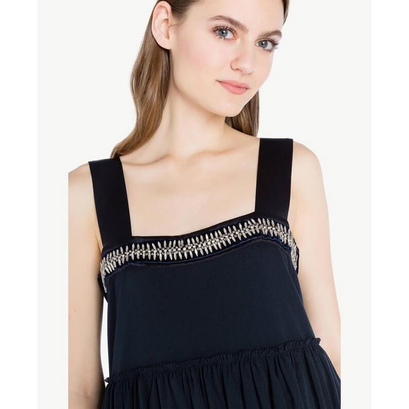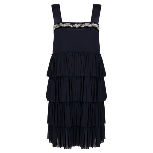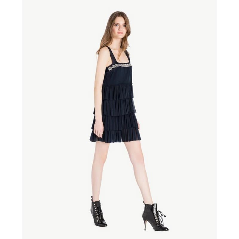 Vrouwelijk, kort donkerblauw kleedje van Twinset. Deze jurk is opgebouwd uit doorschijnende laagjes chiffon stof, waardoor je een sierlijk effect krijgt. De schouderbandjes zijn gemaakt van satijn. Aan de voorzijde heeft de jurk sierlijke steentjes op een fluwelen strook.