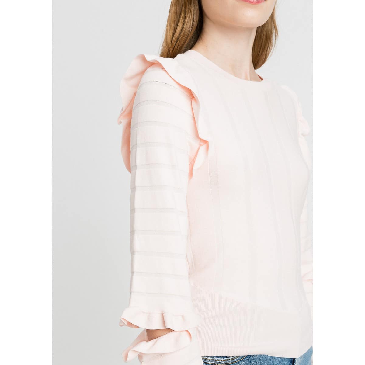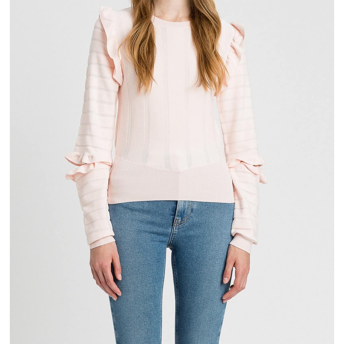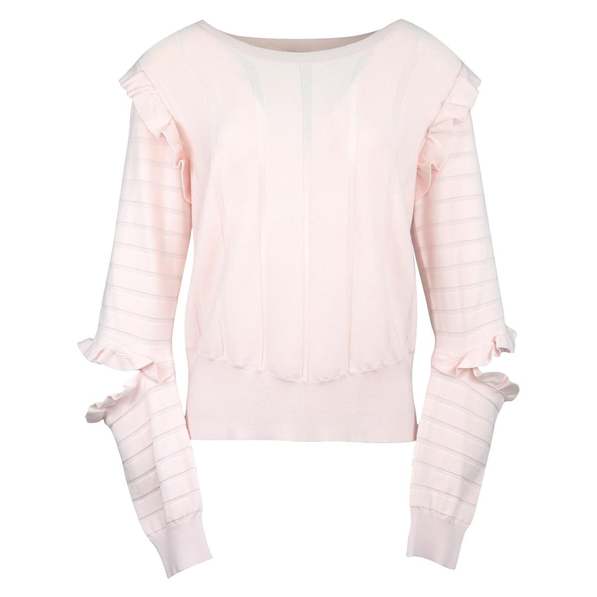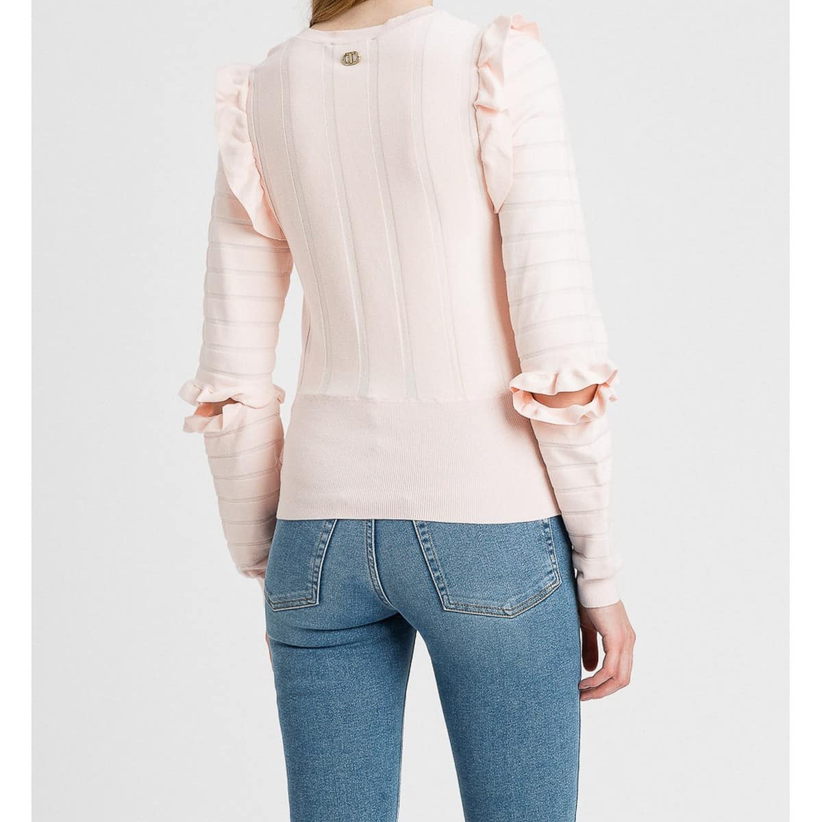 Korte roze pull van Twinset. Deze trui heeft twee opengewerkte mouwen met ruches en bij de zoom een aansluitende pasvorm. De roze sweater heeft een ronde hals en is in strepen gebreid.