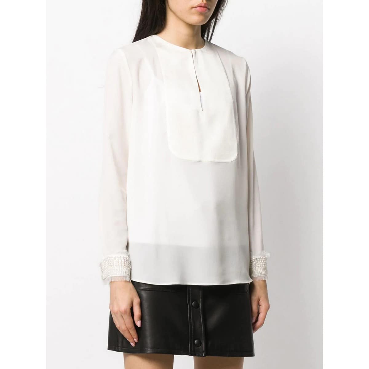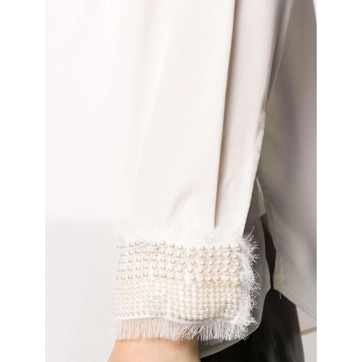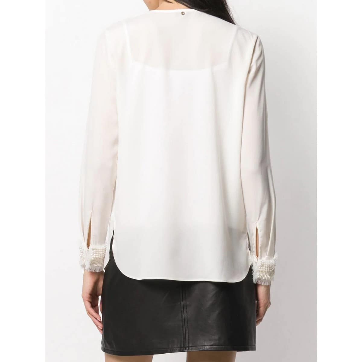 Gebroken witte blouse van Twinset. Deze blouse is gemaakt van een matte stof met bij de borst een satijnen strook. Deze satijnen strook wordt doormidden gedeeld door een keyhole die sluit met een knoopje. De manchetten zijn bewerkt met pareltjes en hebben verfijnde franjes.