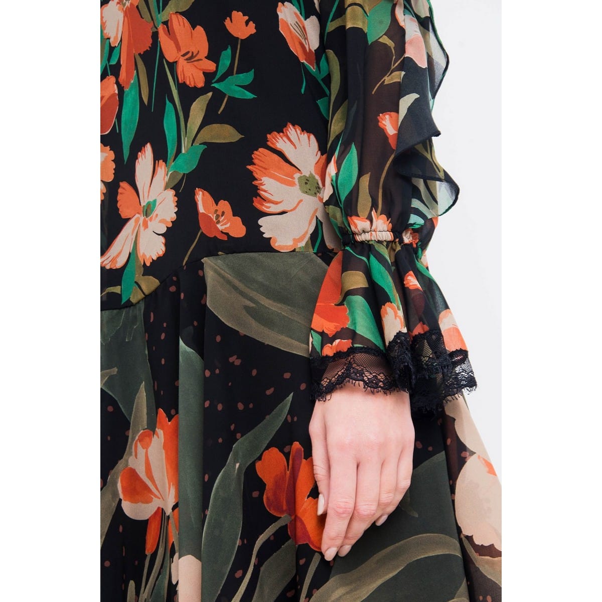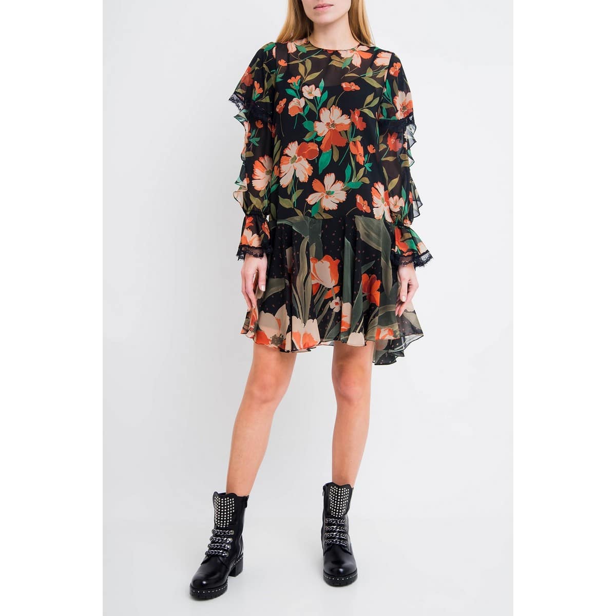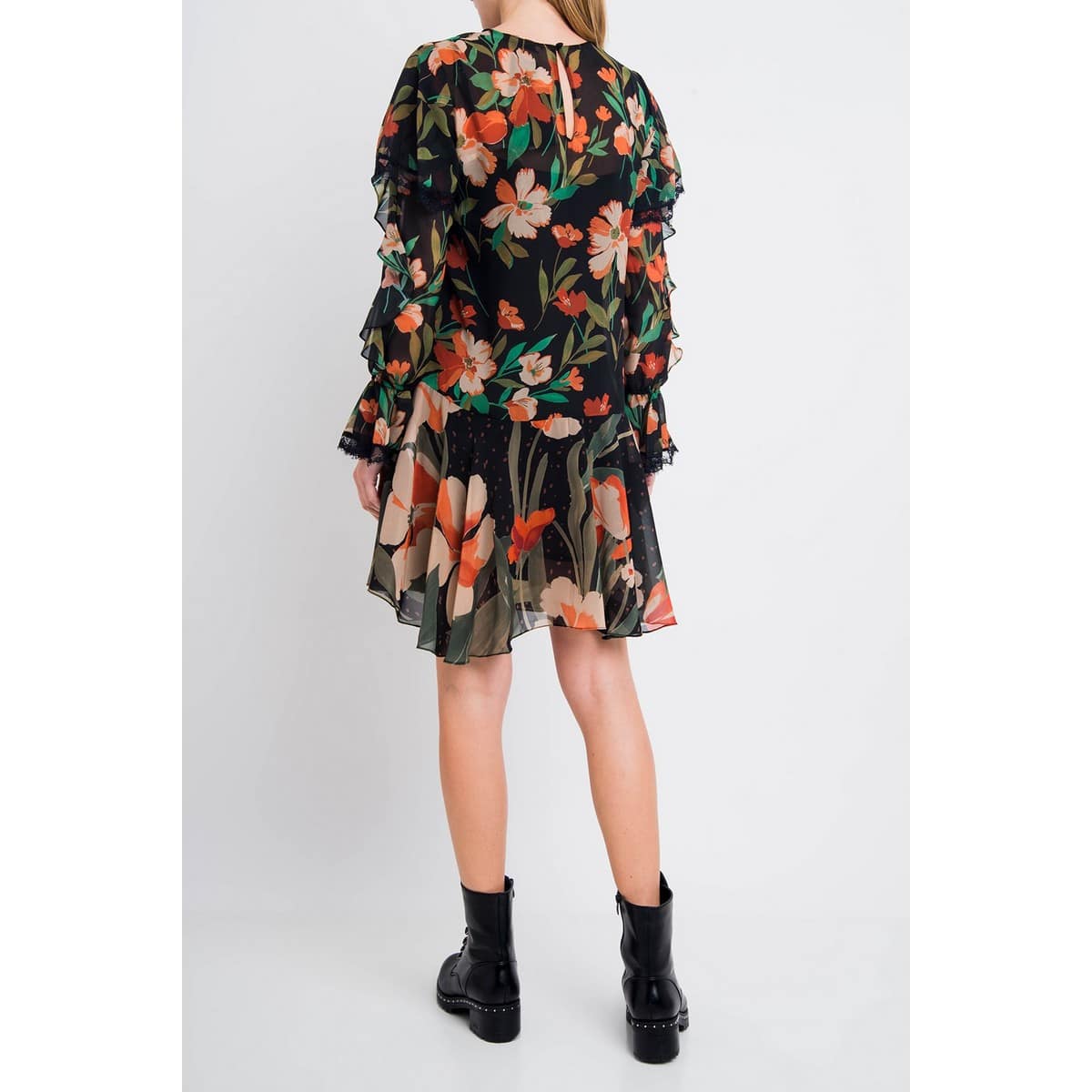 Zwierig kleedje van Twinset. Deze korte jurk heeft een effen zwarte onderjurk met een zwarte bovenlaag met bloemen. De jurk heeft een rond hals die sluit met een klein knoopje aan de achterzijde en heeft lange mouwen met ruches en kant.