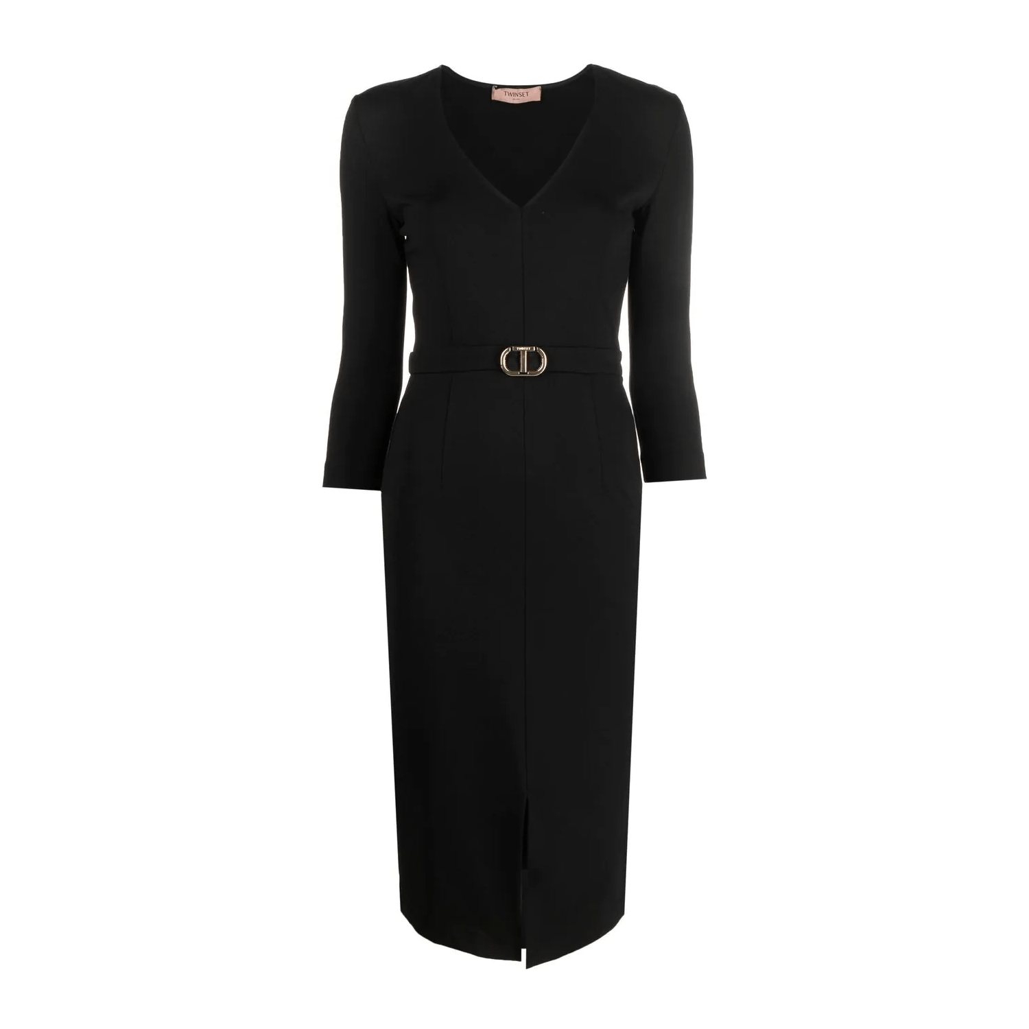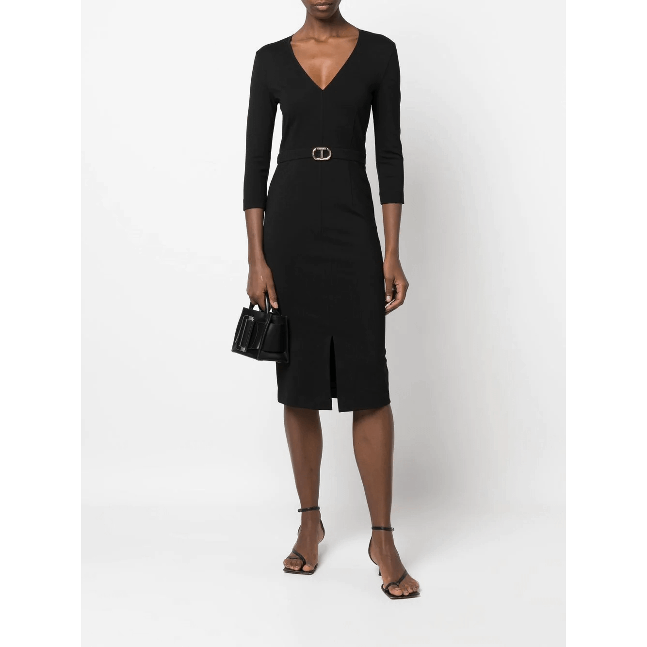 Zwart kleedje van Twinset. Deze midi jurk is gemaakt van zwarte stretch stof en sluit met een verborgen ritssluiting aan de zijkant. De jurk is heeft een aansluitende body, driekwart mouwen en een rechte rok met een split aan de voorzijde. De V-hals geeft deze jurk een vrouwelijke look en het logo op de voorzijde maken de jurk af.